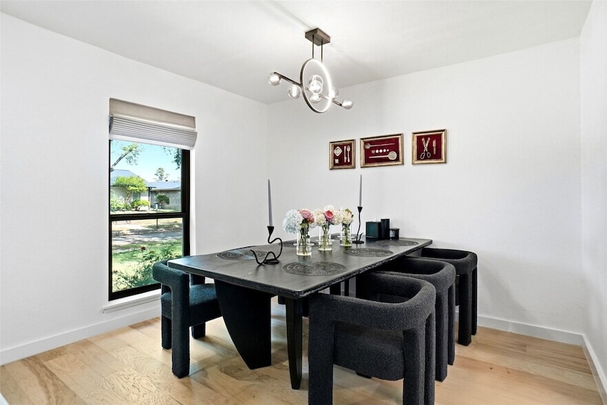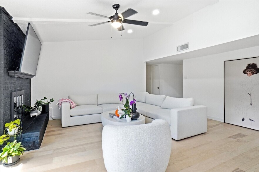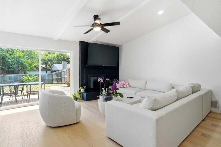 Fully updated and move-in ready, this 3-bedroom, 2-bath home offers a clean, modern feel with a functional layout in a prime Carrollton location. Step inside to a bright, open-concept living space featuring vaulted ceilings, wide-plank flooring, and a striking painted fireplace that anchors the main living area. The updated kitchen is designed for both everyday living and entertaining, complete with white cabinetry, quartz-style countertops, stainless steel appliances, and a large island with seating. The home offers multiple living and dining areas, giving you flexibility for a second living space, home office, or formal dining setup. The private primary suite includes an updated ensuite bath and walk-in closet, while two additional bedrooms are well-sized and share a refreshed secondary bathroom. Enjoy a spacious backyard with a patio perfect for relaxing, entertaining, or letting pets play. Washer, dryer, and refrigerator are INCLUDED for added convenience helping reduce your upfront move-in costs. Located near shopping, dining, and major highways, this home will be ready for move in beginning June 15th.