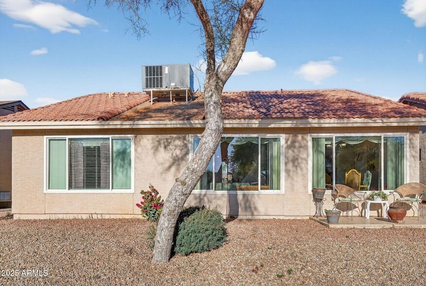 55+ SunBird Golf Resort! Extended Carmel Model Relax on your back patio & watch the quail play around the large arroyo! Appealing features include: tile roof, Trane AC-2010, thermal dual-pane windows, sunscreens, 2 security doors, garbage pail enclosure, extra insulation in attic, epoxy finished cement surfaces,, ''knock-down'' vaulted ceilings, smooth-top stove, side-by-side refrig/freezer w/icemaker, tile countertops in Kitchen, newer lights & fans! New tile floors in full 2nd Bathroom & 3/4 Master Bathroom! Cabinets in 1.5 car garage! Enjoy the adult lifestyle of SunBird Golf Resort! 43,000 sq ft Clubhouse & Recreational Area & golf. Must see to appreicate. Thx for showing.