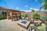 Experience a luxurious Arizona retreat and feel at home in this 4-bedroom, 2.5-bathroom vacation rental in Surprise. This spacious 2,700-square-foot home offers a comfortable and memorable stay. This home boasts a modern interior with 5 Smart TVs (streaming only; no cable/satellite) and 2 sofas. The fully equipped kitchen includes a dishwasher, refrigerator, stovetop, 2 ovens, microwave, coffee maker, dining table, breakfast bar, and granite countertops. Enjoy outdoor living with a kitchen, fridge, gas grill, linear fireplace, gas fire pit, private pool with baja deck, hot tub, putting green, and covered patio. Other amenities include free Wi-Fi, ceiling fans, central air conditioning, central heating, linens, towels, complimentary toiletries, a hair dryer, an iron/board, trash bags, and paper towels. There is an optional pool heat fee of $100/night (plus fees and taxes, paid pre-trip, applied to entire stay). Hit the town by hitting the links at one of the local golf courses before going on a shopping spree! Return to dine al fresco on the patio with a kitchen. Quiet hours are from 11:00 PM to 8:00 AM. No smoking, pets, events, parties, or large gatherings are allowed. This property features 5 exterior security cameras. Camera 1 is located at the front door facing the front entrance, camera 2 is in front of the garage facing the driveway, camera 3 is located on the single-car garage, and cameras 4 & 5 are each on the side of the house facing the gates. The cameras are outward facing and do not look into interior spaces. All cameras record video and sound when activated by motion. [SI]
