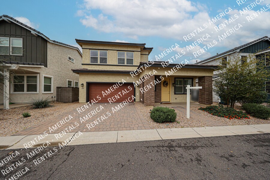 This stunning 2-story home features a 2-car garage and welcoming front porch. Inside, enjoy neutral tones and wood-look tile in high-traffic areas. The bright great room flows seamlessly into a formal dining area, perfect for entertaining. The upgraded eat-in kitchen boasts white cabinets, gray granite countertops, tile backsplash, Samsung stainless steel appliances, a pantry, and an island with a breakfast bar. Upstairs, the master suite offers a private bath with a super shower, dual sinks, and a spacious walk-in closet. Relax outdoors on the extended covered patio. Community amenities include a heated pool, spa, playgrounds, and dog park. One Time Admin Fee: $300, Pet Deposit: $300/pet (if applicable), Service Fee: 2%. $39/month Resident Benefits Package, Helping Heroes Discount Available! Carpet Cats Allowed Community Pool Disposal Dogs Allowed Dryer Garage Gated Community Hardwood Pets Allowed Washer