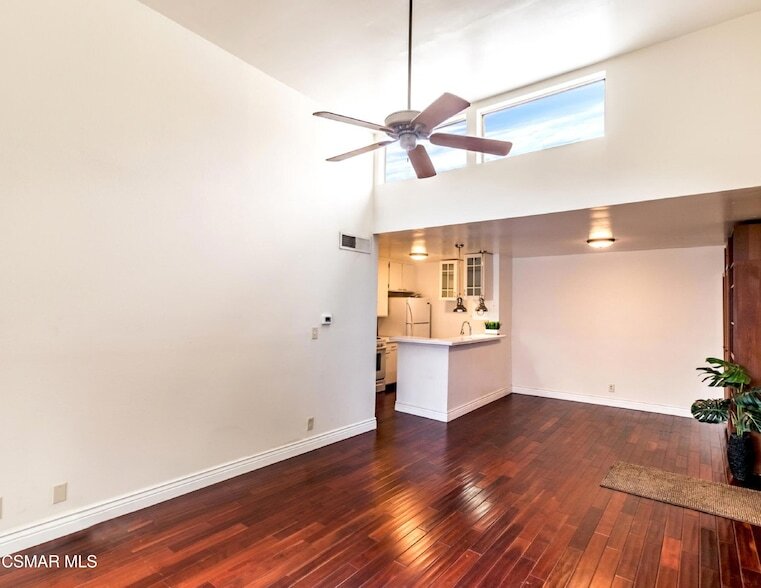 This bright and inviting one-bedroom condo sits in the gated community of California Place. The open living area features high ceilings and skylights that fill the space with natural light, while the private balcony offers a quiet spot to unwind. The kitchen has updated countertops and comes equipped with a refrigerator, dishwasher, and oven. The bedroom is generously sized with plenty of closet space. Enjoy the community's pool, spa, recreation room, and small gym. The unit includes two parking spaces, plus access to the on-site laundry facility. Small pets under 30 pounds are welcome. Conveniently located near Gelson's, Whole Foods, LA Fitness, and Peet's Coffee, with easy access to the 101 Freeway.