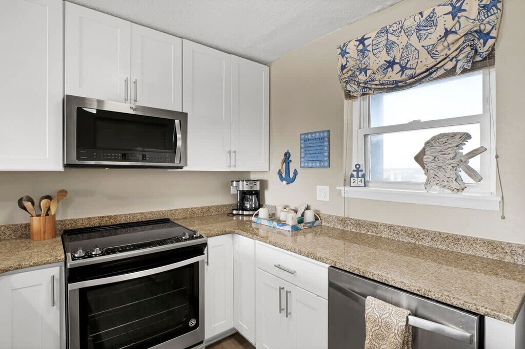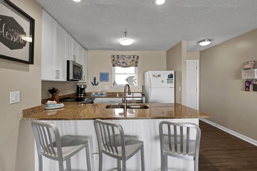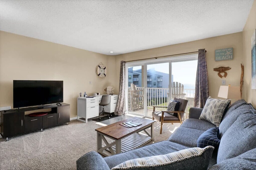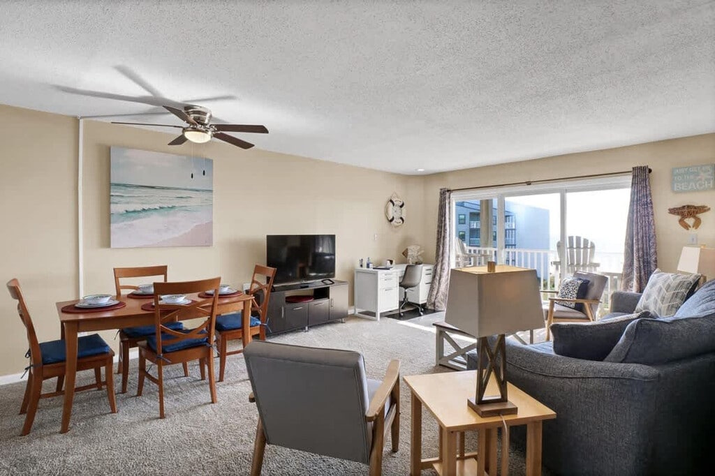Welcome to Seascape, a beachfront property offering breathtaking sunset views and a perfect beach vacation experience. This two-bedroom apartment features a queen bedroom with a full master bath and a second bedroom with a twin-over-twin bunk bed and a full-size bed. Feel at home with a fully equipped kitchen and a dedicated desk space for remote work, all enhanced by free high-speed Wi-Fi. Enjoy the stunning views of dolphins and boats from the balcony. Seascape is designed for relaxation and enjoyment, ensuring you have everything you need for a memorable stay. The apartment comfortably sleeps six guests with its queen bedroom and cozy bunk room for kids. The fully equipped kitchen is stocked with everything needed to prepare meals, making it perfect for whipping up tasty dishes. The dedicated desk space and free high-speed Wi-Fi make it ideal for remote work. HOA-controlled pools are available for guest use from Memorial Day weekend through Labor Day weekend. Openings outside of this time will be at the discretion of the HOA. Experience the beauty of North Topsail Beach with direct beach access for sunbathing and water activities. The serene environment is perfect for families looking for a beach retreat. Enjoy nearby basketball courts and a playground for family fun. For those seeking adventure, beautiful Wilmington is just 40 miles south, offering museums, the Battleship North Carolina, Fort Fisher Aquarium, and a variety of dining options, perfect for a rainy day excursion. Quiet hours are between 21:00 and 8:00. The minimum age requirement for booking is 18. Includes a dedicated desk space for remote work with free high-speed Wi-Fi, ensuring comfort and convenience as you tackle your tasks.