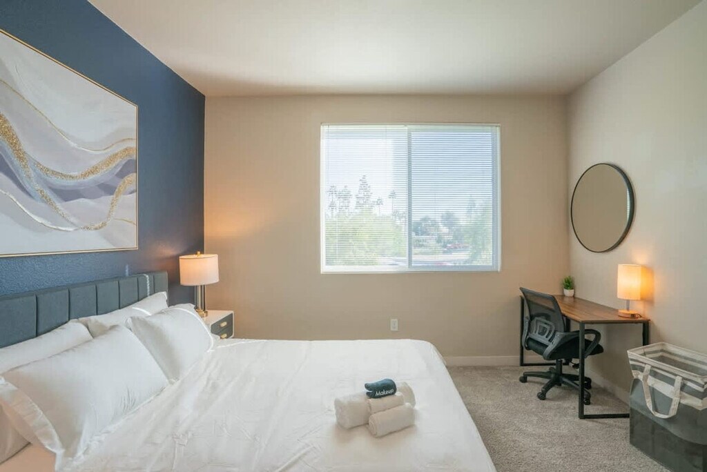 Discover serenity in this chic downtown retreat in the heart of Tempe. Immerse yourself in the vibrant energy of Central Downtown, surrounded by award-winning restaurants, eclectic shops, and historic landmarks. With convenient access to attractions, this stylish apartment serves as your gateway to seamless exploration. Your urban oasis awaits. Relax in this 2-bedroom, 2-bathroom unit designed with a socially and environmentally conscious living environment in mind. The innovative open-concept design blends the living and dining areas with the fully equipped kitchen, creating a modern and sleek living experience. The living room is ideal for relaxing and enjoying the company of friends and family while watching a good movie or a show. Stylish interior design with carefully picked amenities and decorations make up for this lovely space. Parking is available on the premises. Pets are allowed depending on size or if they are service animals. An additional cleaning fee is required per pet: $25 per night for 1-7 nights, $200 for 8-29 nights, and $300 for 30+ nights. There is a 2 pet maximum and only cats and dogs are allowed. If pets are brought without prior notification, there will be a $500 fee. Early check-in and check-out may be accommodated at a fee of $25 per hour, subject to availability. Lost or unreturned keys incur a fee of $80 for key replacements and $150 for key fob replacements. Nestled in the heart of Tempe, this apartment is strategically located near Arizona State University, providing easy access to cultural events, sports games, and academic activities. Explore the thriving Mill Avenue District, a hub for shopping, dining, and entertainment, all within a short distance from your temporary home. Immerse yourself in Tempe's dynamic scene with attractions like Tempe Town Lake, Arizona Mills Mall, and the Desert Botanical Garden. Enjoy diverse culinary delights and vibrant nightlife along Mill Avenue. Outdoor enthusiasts will appreciate Papago Park and the Rio Salado Pathway. The Valley Metro Light Rail is nearby, providing a convenient way to explore neighboring cities like Phoenix and Mesa. Quiet hours are between 10pm and 8am every day. Violations may result in cancellation of booking and removal from the property without refund. There is a strict no-party policy, and unauthorized guests are not allowed, with a $100 fine per guest if discovered. Smoking is prohibited on the property, including balconies and around the building, with a $500 fine for any signs of smoking. Noise monitors are installed in the unit, and tampering with them will incur a fee. Security cameras are in the hallways for safety. Check-in instructions may be withheld until verification is completed. A late check-out fee of $500 applies if not authorized in advance. Includes an office desk and chair in Bedroom 1, perfect for remote work. High-speed Wi-Fi is available throughout the apartment. [SI]