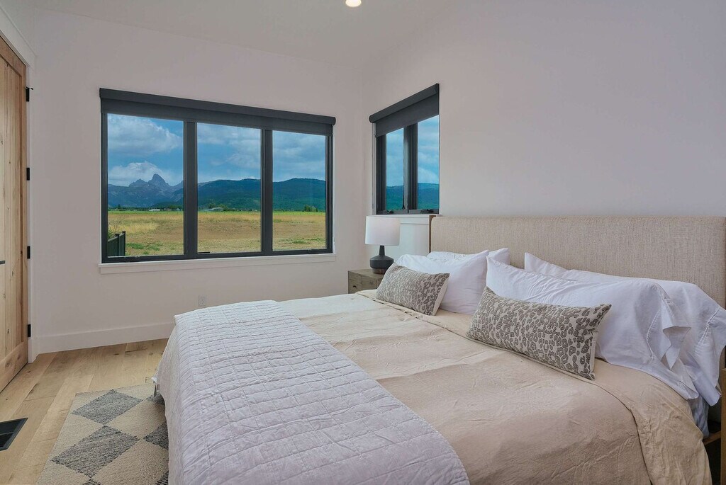 Welcome to a modern mountain retreat in Teton Valley, offering panoramic views of the Grand Tetons. This luxurious 6-bedroom, 4.5-bathroom home spans over 5,500 sq ft and is situated on a private 6-acre lot. Enjoy seamless indoor-outdoor living just 20 minutes from Grand Targhee Resort and 45 minutes from Jackson Hole. This newly built home in Driggs, Idaho, combines modern design with rustic elegance, providing unforgettable views of the Grand Tetons from nearly every room. The spacious layout is perfect for gatherings, featuring a vaulted great room with floor-to-ceiling windows and a cozy gas fireplace. The fully equipped chef’s kitchen is ideal for creating memorable meals. After a day of adventure, unwind in the private hot tub with panoramic views or enjoy a movie night in the home theater with a 4K projector and 120” retractable screen. The home accommodates up to 12 guests across 6 spacious bedrooms and 4.5 bathrooms, including a master suite with a king bed, fireplace, and ensuite with a soaking tub. The property offers ample driveway parking and a garage space. Enjoy the covered front and back patios with seating and a gas grill for BBQ nights. Located in the scenic Teton Valley, Driggs is a peaceful mountain town known for its wide-open landscapes and friendly community. Just 45 minutes from Jackson Hole and surrounded by rivers, trails, and national parks, Driggs offers the perfect balance of nature, privacy, and small-town charm. The home is situated on a quiet 6-acre lot just outside the town center, surrounded by rolling fields and wildlife, yet only 10 minutes from downtown Driggs where you’ll find local coffee shops, farm-to-table restaurants, grocery stores, and art galleries. Outdoor enthusiasts will find paradise here, with Grand Targhee Resort just 20 minutes away for skiing, hiking, and biking, and the Teton River and nearby national forests offering world-class fly fishing and horseback riding. The property does not permit pets or smoking of any kind. Quiet hours are from 8:00 PM to 8:00 AM, and fireworks are not allowed. The maximum number of guests cannot exceed 12. There is a strict no events policy, with violations resulting in a $2,500 fine and immediate cancellation of your reservation. Exterior lights should be turned off at night to preserve the dark sky environment. A maximum of four licensed vehicles are allowed in the driveway, and no recreational vehicles are permitted on the property. The home includes an office with Teton views, perfect for remote work. It features Wi-Fi-controlled heating and cooling zones for comfort during work hours. [SI]