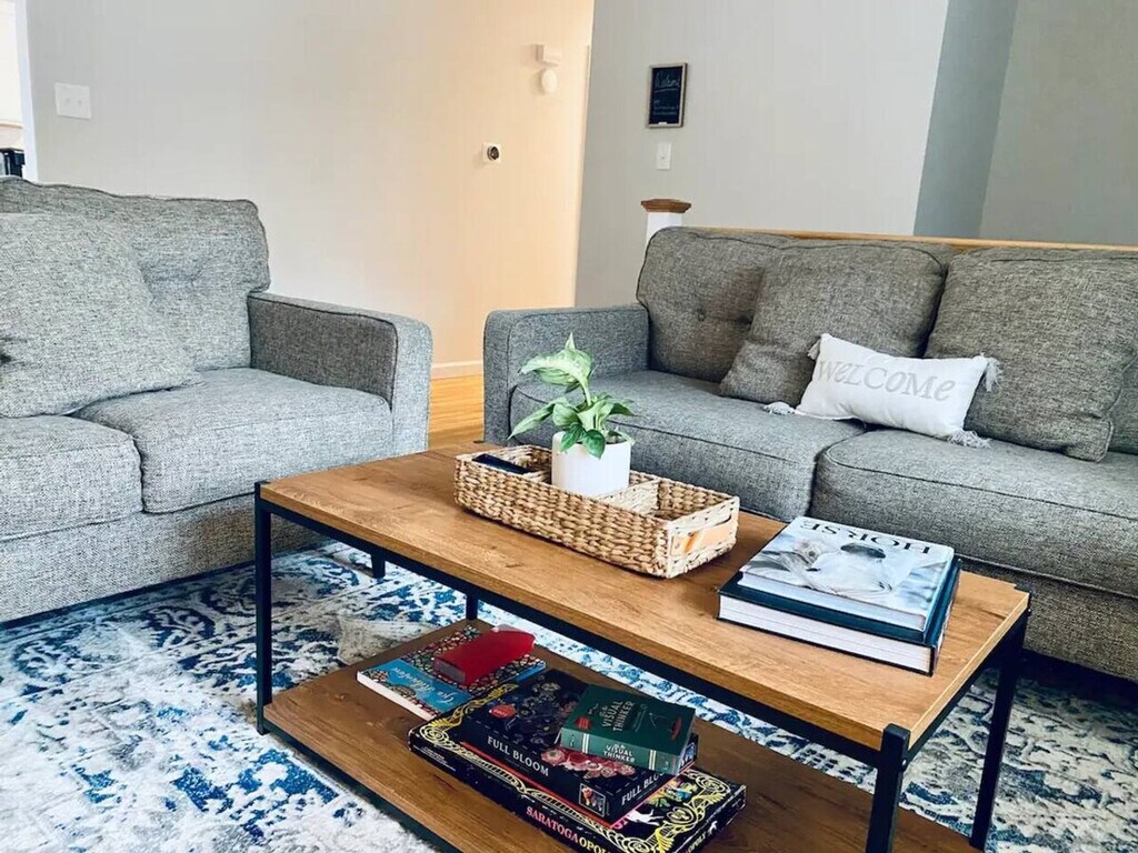 Unwind with your entire family, including your furry friend, in the serenity of this cozy home, just moments away from incredible attractions, shopping, and dining. Feel at home while being just 10 minutes from the Saratoga Raceway and the charming downtown area of Saratoga, where you'll find an array of delightful restaurants and shops. Indulge in world-class concerts at the Saratoga Performing Arts Center, conveniently located less than 5 minutes away. This home offers a comfortable living room with a brand new couch and smart TV, perfect for lounging. The modern and well-equipped kitchen features brand new stainless appliances, seating for 6 guests, and is fully stocked with pots, pans, utensils, a stovetop kettle, a crockpot, and a blender. Each bedroom has a plush queen bed, dresser, and luggage stand, with lamps featuring built-in USB chargers. The large basement includes comfy seating, a desk, and a washer and dryer for extended stays. This dog-friendly home allows a maximum of 2 dogs, preferably aged 2 years and above, with a pet fee of $100 each. The backyard is completely fenced in, providing a safe space for your pets to roam. Free parking is available on the premises, with additional street parking. Located just 1.9 miles from Saratoga Spa State Park, 4.4 miles from Saratoga Race Course, and 3 miles from the Children's Museum at Saratoga, this home is ideally situated for exploring the area. Enjoy proximity to Congress Park Carousel, Saratoga Lake Boat Launch, Brown's Beach, Six Flags Amusement Park, Lake George, and Gore Mountain Ski Area, making it a perfect base for your adventures. Guests are required to sign the property rental agreement, which includes the house rules. The minimum booking age is 25. The home is fitted with a smart door lock for easy access. Guests are responsible for any damage or extra cleaning caused by their dogs during the stay. Dogs must not be left unattended unless crated, and guests are asked to clean up after their pets. The large basement offers a dedicated workspace with a desk and blazing fast internet, perfect for remote work. A laptop computer is not included, but the space is equipped with everything you need for a productive day. [SI]