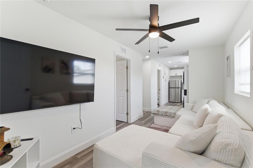 Beautifully designed 2-bedroom, 1-bath ADU built in 2024, offering modern finishes and energy efficient living. Interior features include quartz countertops, stainless steel energy-efficient appliances, luxury vinyl plank flooring throughout, and a spa-style bathroom with floor-to-ceiling porcelain tile. Apartment is equipped with impact-rated windows and full insulation, providing added durability, noise reduction, and energy efficiency.Located in a non-flood zone, approximately 10 minutes to downtown St. Petersburg, with convenient access to dining, shopping, and major roadways. Private assigned garage. Pet-friendly (one-time fee applies). Tenant responsible for utilities. Apply