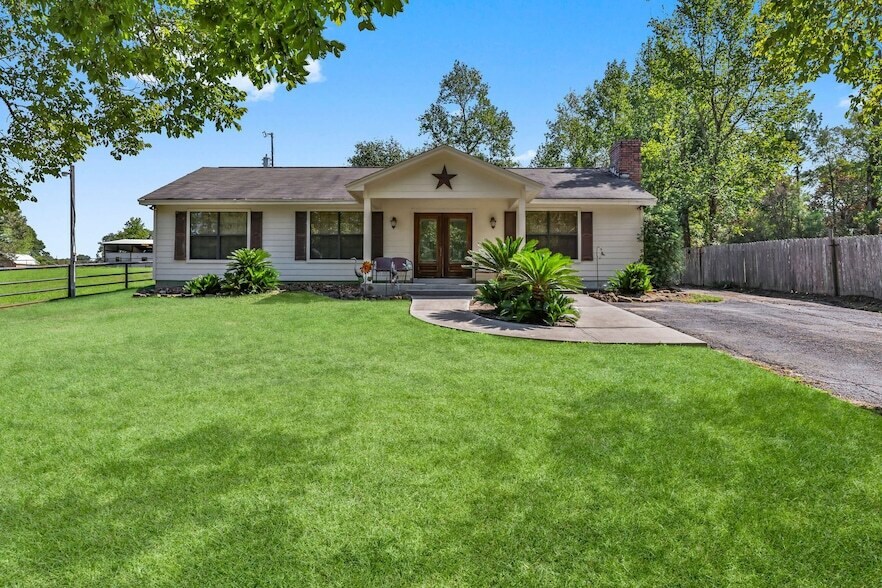 Completely remodeled house w/den, kitchen, breakfast, 2 bedrooms, 1-1/2 baths, 2-car carport, 20'x9' storage, wood burning FP, wood like tile flooring. Surrounded by 10 beautiful acres. Washer/dryer/refrigerator included. There is a second house on property. Room sizes need to be verified. Centrally located between the City of Montgomery & Conroe. 5 minutes to Hwy 105. Also for sale.