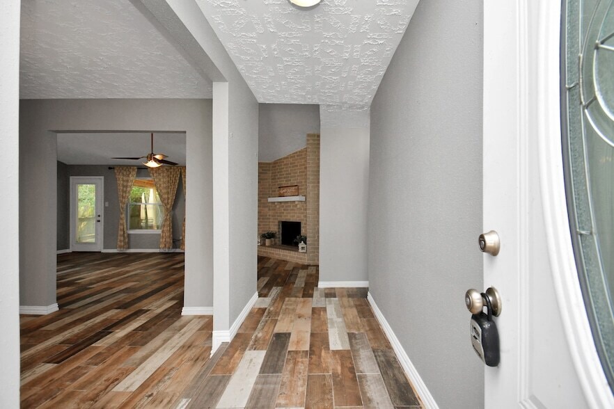 Located on a quiet cul-de-sac in Williamsburg Hamlet, this move-in-ready 3-bedroom, 2-bath home blends modern updates with everyday comfort. The open living, dining, and kitchen layout creates a seamless flow that s perfect for entertaining or relaxing at home. The renovated kitchen is a true standout with quartz countertops, classic subway tile, bright white cabinetry, a center island, breakfast bar, and stainless-steel appliances refrigerator included. Enjoy no carpet anywhere in the home stylish wood-look tile in the main areas and wood-style flooring in all bedrooms for easy maintenance. The primary suite offers generous space and an updated en-suite bath. Out back, unwind under the covered patio surrounded by mature trees, or enjoy quick access to the nearby community pool. Zoned to Katy ISD with convenient access to I-10, Grand Parkway 99, shopping, and dining. Schedule your showing today!