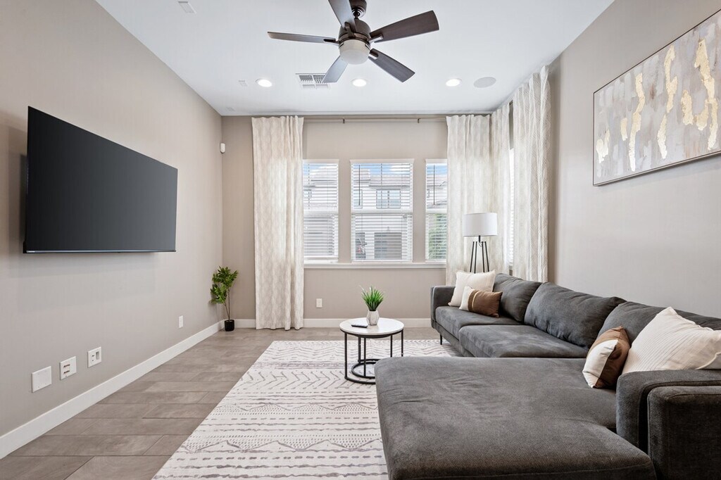 Feel at home in this spacious two-bedroom, 2.5-bath apartment with a loft, located in a gated community. The apartment features two king-size beds and two sofa beds, providing ample space for relaxation. Enjoy the convenience of a fully furnished home with a full kitchen and dining set, as well as a washer and dryer. The back patio offers a perfect spot to unwind. This apartment is thoughtfully designed with four smart TVs and a fully equipped kitchen, ensuring you have everything you need for a comfortable stay. The gated community includes a pool, and the apartment is pet-friendly with a fully fenced area for your furry friends. Pets are welcome with a non-refundable fee of $150 per pet. The community offers a pool for residents to enjoy. Situated in a prime location, this apartment is close to several hospitals, including Banner Ocotillo Medical Center (4.6 miles) and Mercy Gilbert Medical Center (4.9 miles). Enjoy nearby attractions such as Downtown Gilbert (4.7 miles) and Chandler Center for the Arts (5.4 miles). The apartment is also conveniently located near Chandler Airport Center (2.9 miles) and Phoenix Sky Harbor International Airport (22.2 miles). Self-check-in is available with a smart lock and lockbox for your convenience. Smoking and parties are not allowed on the premises.