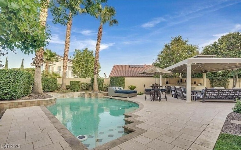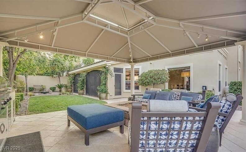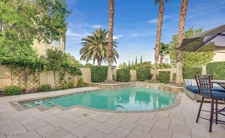 STUNNING SUMMERLIN HOME WITH CUSTOM UPGRADES IN GATED COMMUNITY*SPARKLING POOL WITH WATERFALL*NEARLY 1/4 ACRE PRIVATE LOT*DRAMATIC FOYER ENTRY*CUSTOM FINISHES THROUGHOUT*CUSTOM FLOORING*CUSTOM 2-TONE PAINT*CEILING FANS*3 GAS FIREPLACES*RENOVATED KITCHEN WITH STAINLESS APPLIANCES, WATERFALL EDGE QUARTZ COUNTERS, CUSTOM CABINETS & BUILT-IN FRIDGE*SPACIOUS LIVING, DINING & FAMILY ROOM AREAS*CUSTOM BUILT-INS IN FAMILY ROOM WITH INCLUDED TV*DOWNSTAIRS BED & BATH WITH EZ ACCESS TO POOL*OVERSIZED PRIMARY SUITE WITH SITTING ROOM/DEN, WALK-IN CLOSET & BALCONY ACCESS*RENOVATED PRIMARY BATH WITH LARGE SOAKING TUB & SEPARATE WALK-IN SHOWER*NICE-SIZED 2ND BEDROOMS*RESORT-STYLE BACKYARD*SCREENED-IN PORCH & HUGE SEPARATE CABANA WITH BUILT-IN OUTDOOR KITCHEN & FIREPIT*MATURE GRASS, TREES & FOLIAGE*CONVENIENT LOCATION NEAR SUMMERLIN PARKS, MILES OF JOGGING/WALKING/BIKING TRAILS, GOLF, GOLDEN KNIGHTS PRACTICE ARENA, LAS VEGAS BALLPARK, RED ROCK RECREATION AREA & DOWNTOWN SUMMERLIN RETAIL & RESTAURANTS*