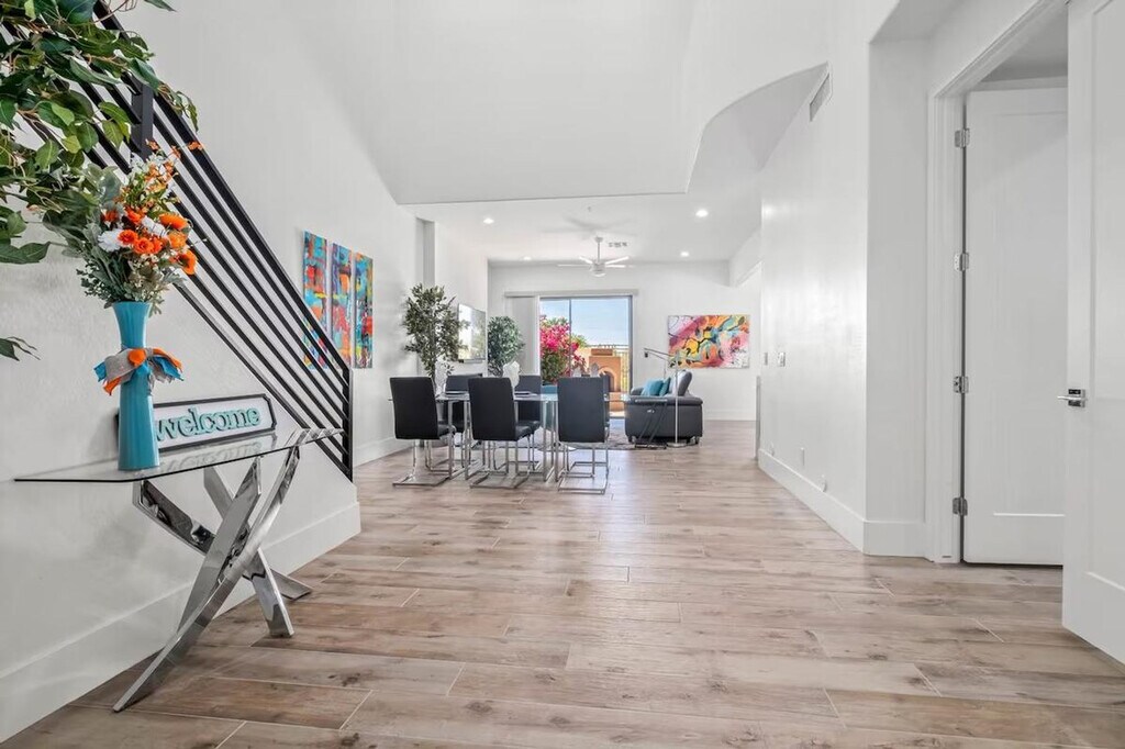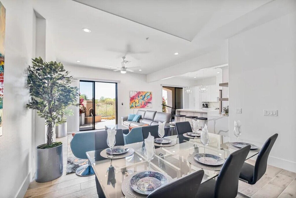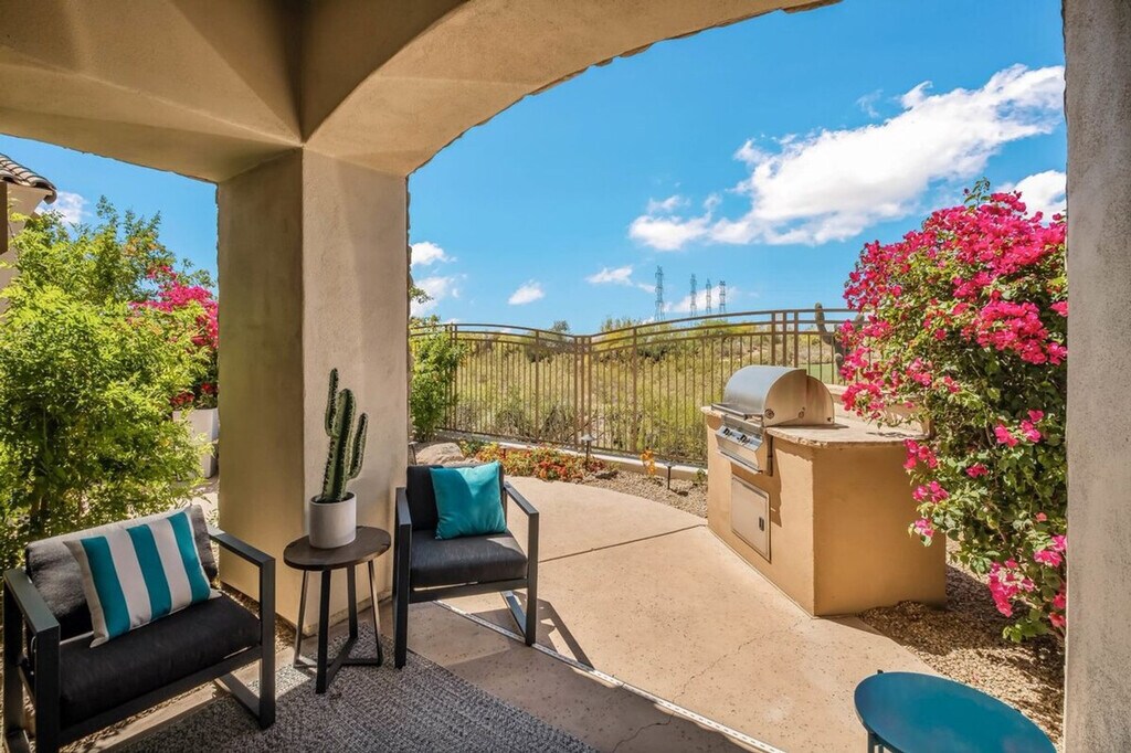 Welcome to Villa Grayhawk, a newly renovated 3-bedroom, 3.5-bathroom townhome in North Scottsdale. This property feels like a private home with a private backyard, only one shared wall, and no one above. Enjoy outdoor living with a BBQ, outdoor fireplace, and entertaining area. The townhome offers a golf course view and is conveniently located just 3 minutes from shopping and restaurants, and 5 minutes from Hwy 101 (Pima exit). The gated community of Grayhawk offers a heated pool, two hot tubs, a gym, a lit tennis court, and a basketball court, all just a short walk from the property. This townhome features two master suites, and the third bedroom has an en-suite full bathroom. Each bedroom and the living room are equipped with wall-mounted flat-screen smart TVs, driven by high-speed internet and offering live YouTube TV. The property includes a private garage for one large or two small vehicles, with additional street parking available nearby. The property includes a private garage for one large or two small vehicles, with unlimited additional street parking available approximately 300 yards away. Located in South Grayhawk, this townhome provides easy access to miles of walking and bicycle trails right out your front door. Two cruiser bikes are provided for your enjoyment and adventure. The community pool and hot tubs are just 200 yards away, making relaxation and recreation easily accessible. No pets are allowed in this property. The minimum stay is 30 days. Guests are liable for any damages caused to the property. All linens, bath and pool towels are provided, along with free Wi-Fi and cable TV. Check-in and check-out times are flexible, and access is secured with a coded gate for security. [SI]