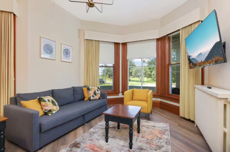 Property Id: 1948879 Step into a spacious 1BR tucked inside a stately 1880s mansion, perched directly across from Indian Mounds Park with sweeping river and city views. Located on the ground floor of our 3-story building, this bright unit is perfect for 1-2 guests and even welcomes pets (with fees). Quiet corner living, free and easy street parking, shared washer/dryer in the basement, and added security with entrance camera. Monthly fee includes utilities such as WiFi, electricity, heating, water, etc. Sleeping arrangements: -king-sized bed in the bedroom -In the living room, we have a sleeper sofa that can turn into a queen-sized bed. We've equipped the house with top-notch appliances and stylish furniture for your comfort. - High Speed WiFi - luxxe mattress - Smart TV (please use your personal login details) - HD TV with variety of channels via Roku - microwave - Stove - Kettle - Refrigerator - Basic cooking utensils - Dinnerware and silverware - Pour over coffee maker