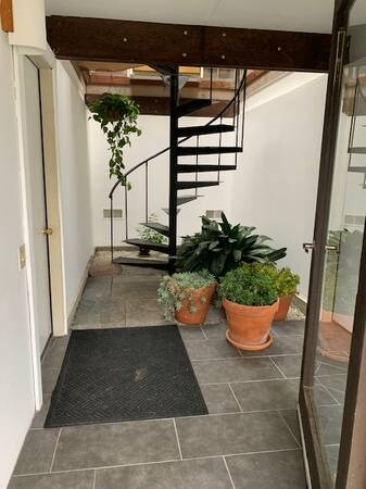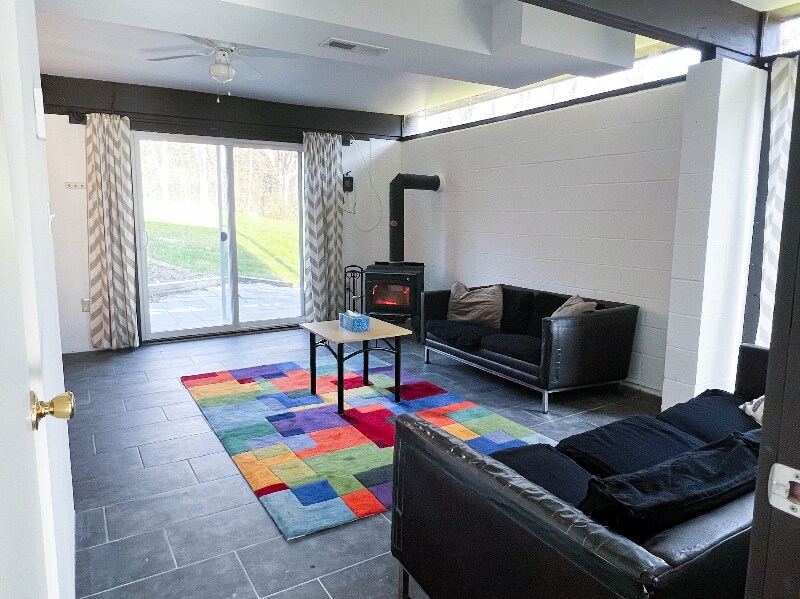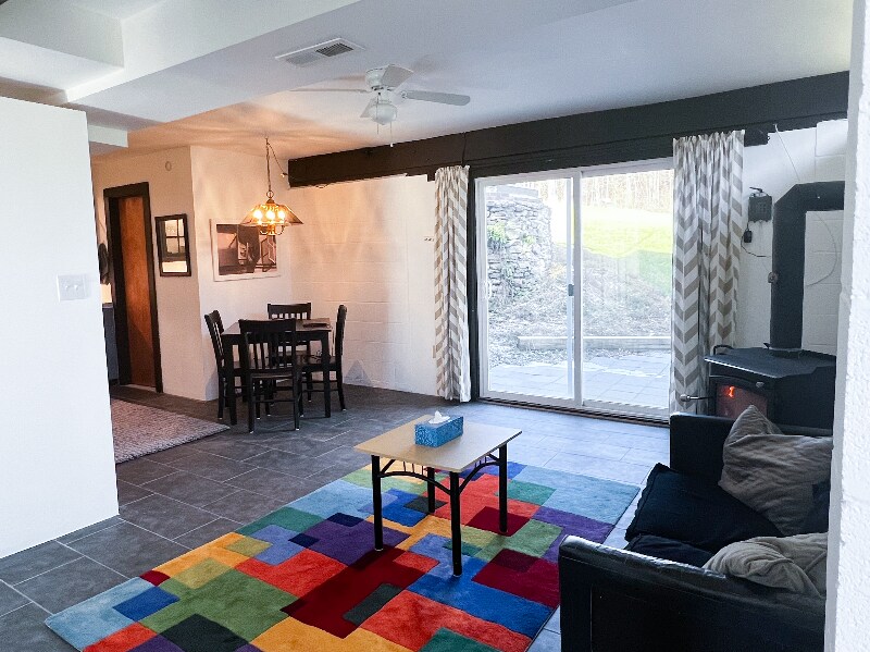 Property Id: 795970 Newly renovated first floor apartment only 5 miles from Cornell and Ithaca College. This one-of-a-kind home sits on nearly 100 acres of private park-like land, where the nature lover can enjoy peace and quiet yet be only minutes from downtown Ithaca. This architect-designed 750+ SF apartment features a two story skylit foyer and panoramic views through huge, sun-filled windows. The large bedroom is 12x16; the 15x17 living/dining room has a wood burning stove sized to heat the whole apartment and french doors opening to a private patio. The apartment features heated radiant stone floors and 2-zone mini-split for silent heating and air conditioning with WiFi thermostats for each room. The all-new kitchen has a gourmet glass-top range and full-size dishwasher and stainless refrigerator. The separate laundry room features new washer and dryer. Landlord pays internet, water, and sewer; tenant only pays electric. There is parking for 2 cars. Available May 1st - shown by appointment.