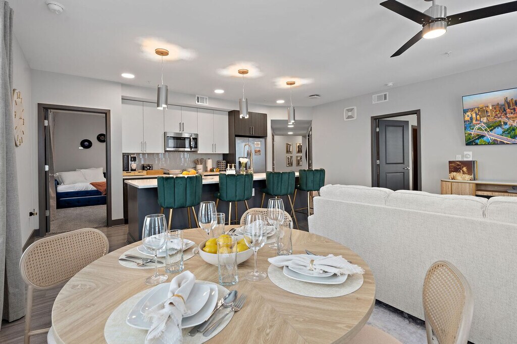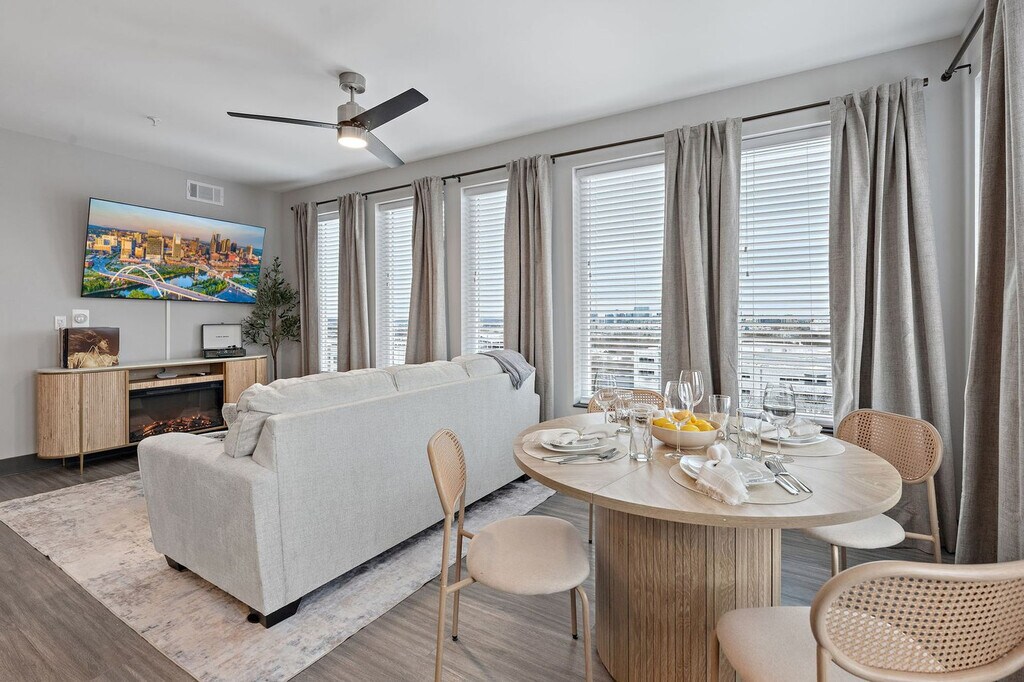 Feel at home in this modern 2-bedroom, 2-bath Midtown Nashville apartment, your perfect Music City retreat. Located in a luxury building, this stylish vacation rental offers beautiful city views and two reserved parking spots. This elegantly designed apartment blends elevated comfort with modern charm. The primary suite features a king-size bed with premium linens, while the second bedroom offers a chic full-size trundle, sleeping up to three. A plush pull-out sofa in the living area provides added flexibility. Enjoy a heated pool, barbecue, unlimited pool and foosball games, board games, Google TV and Tuvi, drip coffee and Keurig, an electric kettle, a gym, fast Wi-Fi, welcome snacks and water, and a fully stocked chef’s kitchen with body wash, shampoo, and conditioner. Early check-in and late check-out requests are subject to availability and may incur an additional fee of $50. Located in Nashville's vibrant Midtown neighborhood, this apartment offers unparalleled access to the city's best. You're just minutes from downtown's lively entertainment scene and steps away from an array of restaurants, shops, and attractions. Explore the iconic Parthenon in Centennial Park, visit Vanderbilt University, or take advantage of the proximity to top-rated hospitals. Quiet hours are from 10:00 PM to 7:00 AM. Smoking is strictly prohibited indoors and on the premises. Parties or gatherings beyond your reservation are not permitted. All guests are required to complete a quick verification to comply with local rental regulations and help protect the apartment and guests. Check-in is at 3:00 PM and check-out is at 10:00 AM. Registration Number: [SI]