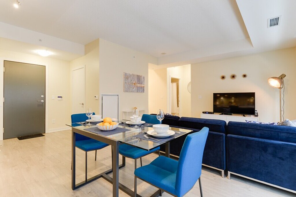 Feel at home in this fully furnished modern executive suite located in the heart of Downtown Toronto, within the vibrant Entertainment District. This apartment offers a private space with a balcony, perfect for enjoying the city's atmosphere. Situated within easy walking distance to shopping, cafés, bars, and all city highlights, this apartment provides the ideal urban living experience. Designed with you in mind, this apartment comes with everything you need to simply unpack and stay. Enjoy a private space all to yourself, including a balcony that offers a perfect spot to relax and take in the city's vibrant atmosphere. Parking is not included. Please reach out for availability and rate. Interim housekeeping services are also not included, but can be arranged upon request for an additional fee. A starter kit is provided in the apartment for your convenience, including soap, shampoo, dishwasher and laundry pods, toilet paper, and paper towels. Please replenish as required. Nestled in one of the trendiest neighborhoods, the Entertainment District, this apartment is within easy walking distance to shopping, cafés, bars, and all city highlights. Experience the best of Downtown Toronto right at your doorstep. Check-in may require a stop at a nearby building to collect keys if arriving outside business hours (after 5pm Mon-Fri). Important house rules include no parties, no smoking, and no pets. [SI]