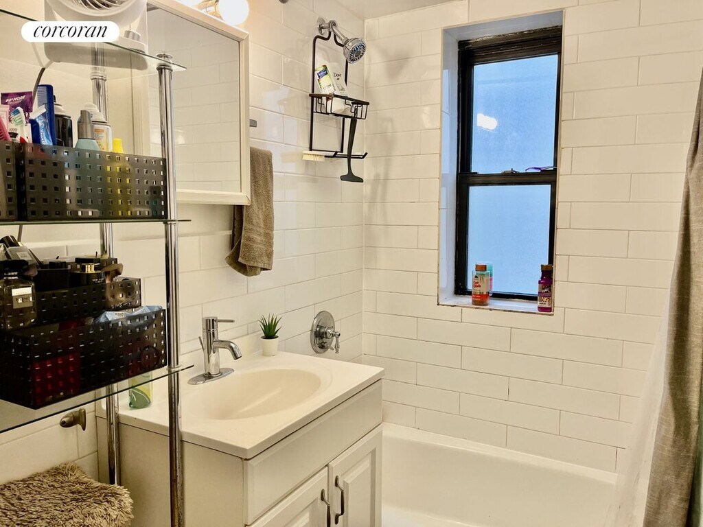 Large (633 sq ft), modern, bright, renovated one bedroom with entry foyer and GREAT layout, with large two-exposure bedroom separated from living room / dining room by hallway and bathroom for privacy. This corner one bedroom apartment is filled with sunlight and features a kitchen with stainless steel appliances and a dishwasher, hardwood floors and tons of closets. Thru-wall a/c in living and bed rooms. The Rosehill is a great building in the heart of great neighborhood, close to everything Manhattan offers, on quiet street. Live-in super. Laundry in basement.
