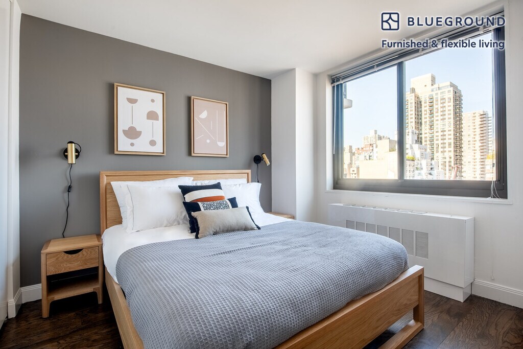 Show up and start living from day one in New York with this stylish one bedroom Blueground apartment. You’ll love coming home to this thoughtfully furnished, beautifully designed, and fully equipped Yorkville home with stunning high floor views over the city. (ID #NYC505) The advertised rate of $4,660/month is the lowest available price, based on a 1 month(s) and 17 day(s) stay with a move-in date of December 21, 2025. If you’re looking for a 1-year stay, the rate is $5,980/month. Rates vary depending on the duration of stay, season, and other parameters. For exact pricing and additional pricing components, please visit our website and enter your desired move-in and move-out dates. The rate is applicable when billed upfront; it can be higher if billed in multiple payments. Brokers are welcome to reach out. Were you looking for an unfurnished lease? Try Blueground instead and upgrade from unfurnished to furnished living: - Furnished at rates comparable to unfurnished - No setup or furniture costs - save thousands - Move-in ready - save time, just bring your suitcase Designed with you in mind As with any Blueground apartment, you’ll find a thoughtfully designed space complete with beautiful furniture and a fully equipped kitchen in this one bedroom property. And, thanks to our superior quality mattresses, luxury linens, and towels, you can relax knowing you’ll always feel comfortably at home. When you’re ready for some fun, you can take in the New York vibes or bring the entertainment to you with the premium wireless speaker or smart TV. Sleeping arrangements Queen Bed, 63in/160cm Amenities Building amenities unique to this one bedroom apartment include an on-site: - Doorman - Dryer in building - Elevator - Washing machine in building - Pets allowed - Playroom Arrival and ongoing support The entire apartment is yours to enjoy! Throughout your stay, you’ll have access to our Client Experience team through the Blueground App. You can schedule additional cleanings, submit maintenance requests, and view our neighborhood recommendations with just a few taps. We’ll share all details upon confirmation of your stay. Other things to note Building amenities may have an extra cost. This Blueground apartment has flexible lease options, allowing you to book it for one month, a year, or more. Pets are welcome, though weight limits and breed restrictions apply and may incur fees. Brokes CYOF. We take great pride in ensuring every photo displayed is shot in our own units with our actual furnishings. That said, we regularly refresh our decor and furniture arrangement, which may differ from what’s pictured. Also note - Other apartments in this building are undergoing renovations, and you may hear construction noise inside your apartment from time to time - The apartment's building is undergoing renovations, and you may hear construction noise inside your apartment from time to time - Some building amenities may be unavailable because of current renovations