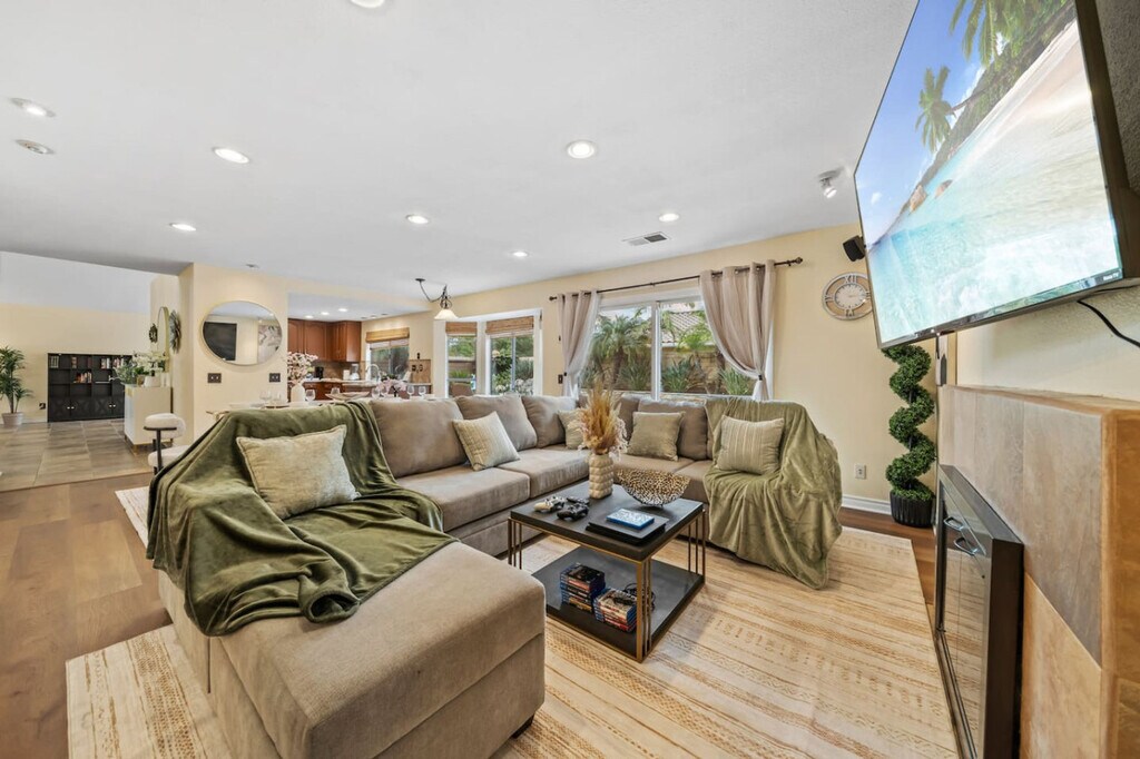 Welcome to this inviting family home in the affluent neighborhood of El Cajon, San Diego. This spacious residence features four bedrooms, accommodating up to eight adults, with a bedroom and bathroom conveniently located on the ground floor. The property boasts a surrounding gated yard with a pool, hot tub, and grill, and offers garage and driveway parking for up to four cars. The living area is centrally air-conditioned and features a 75-inch flat-screen smart TV, perfect for enjoying cable channels or streaming services like Netflix and Disney+. The modern kitchen is fully equipped with all necessary appliances, including a coffee machine, and is stocked with essentials like coffee and cooking oil. Dining options abound with seating for at least 16 people both inside and outside. Pets are welcome in this home. Enjoy the convenience of in-unit laundry with a washer, dryer, and detergent provided. Parking is available in a secured garage and driveway for up to four cars. Situated in a wealthy neighborhood in El Cajon, this home offers easy access to local attractions and amenities. Use Google Maps with "Pierce Ct, El Cajon CA 92019" for accurate distances to various destinations. Smoking is only permitted outside the home, and excessive noise may lead to a $1,000 violation fee. Unauthorized late check-outs may incur additional charges, and only guests and pets counted on the reservation are allowed on the property, with a $100 fee per unauthorized guest or pet per day/night. The pool and spa should not be operated without prior permission to avoid a $500 fine. For those working remotely, the home offers a choice of desks and chairs both inside and outside, along with Fiber 500 Mbps fast Wi-Fi, making it easy to host online meetings or share large files. [SI]