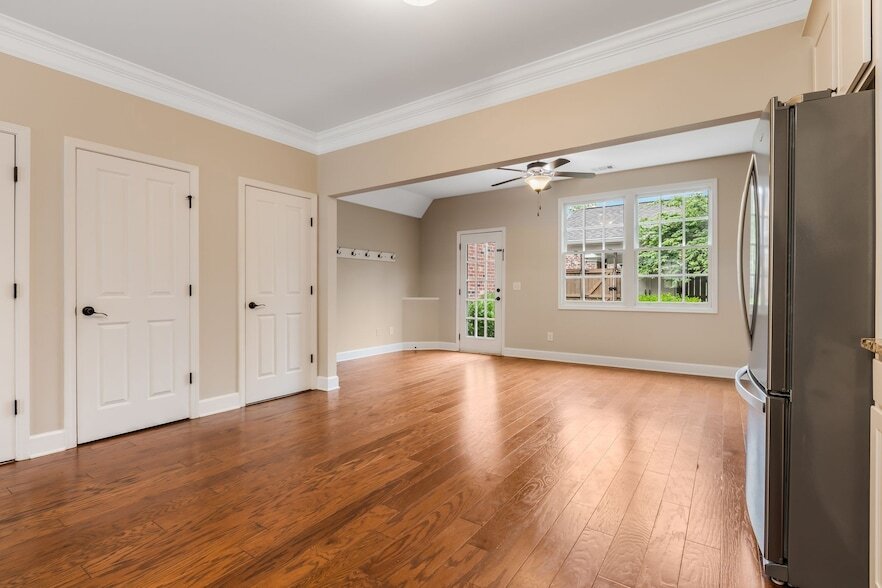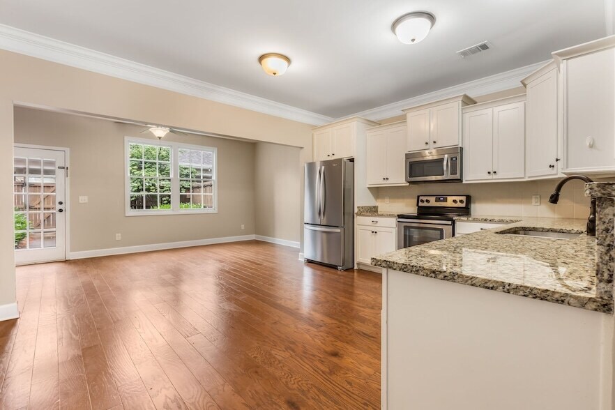 Beautiful 3 bed, 2 1/2 bath all brick townhome in highly sought Berry Farms! Hardwoods throughout, granite countertops, SS appliances and large open concept living space with lots of natural light! Built ins and tons of storage, whole house water filtration, outdoor shed, new fridge and washer/dryer can remain. Enjoy outdoor gatherings or peaceful mornings in the charming courtyard, perfect for entertaining guests or savoring a cup of coffee in solitude. The attached carport ensures ease and accessibility. Berry farms is a self contained walkable community with grocery, shopping, restaurants, parks, and resort style amenities! Less than a mile from interstate access. Owner will consider lease terms between 6 to 18 months.