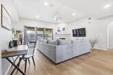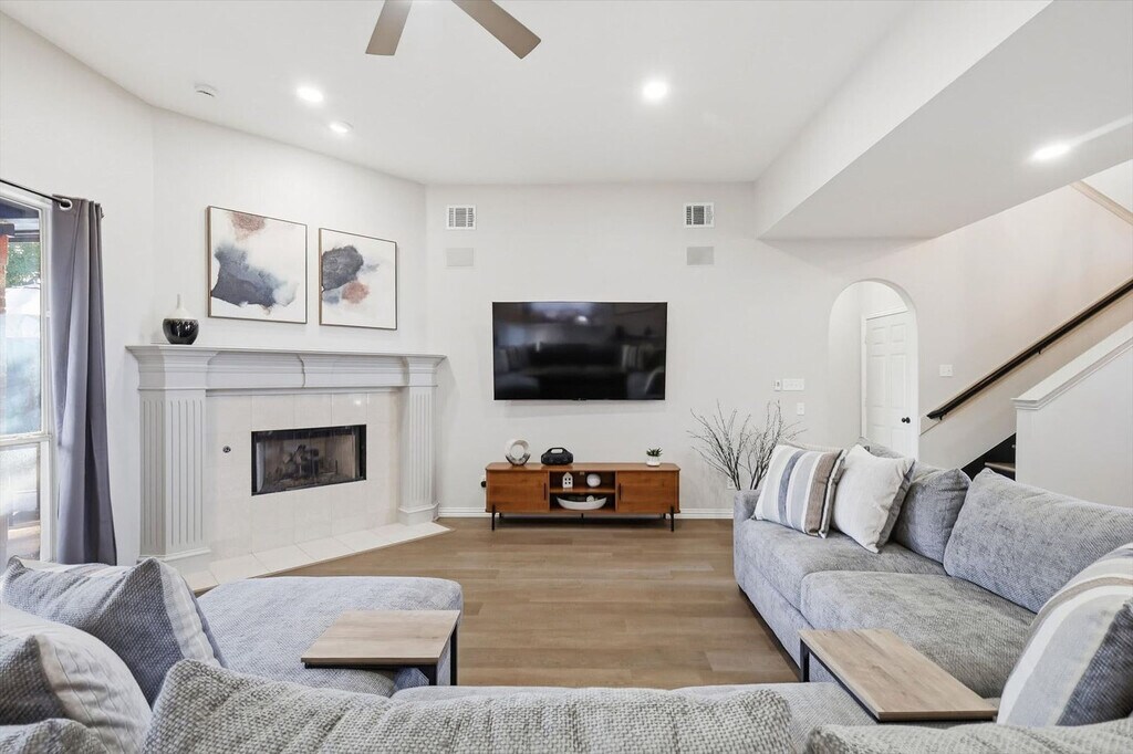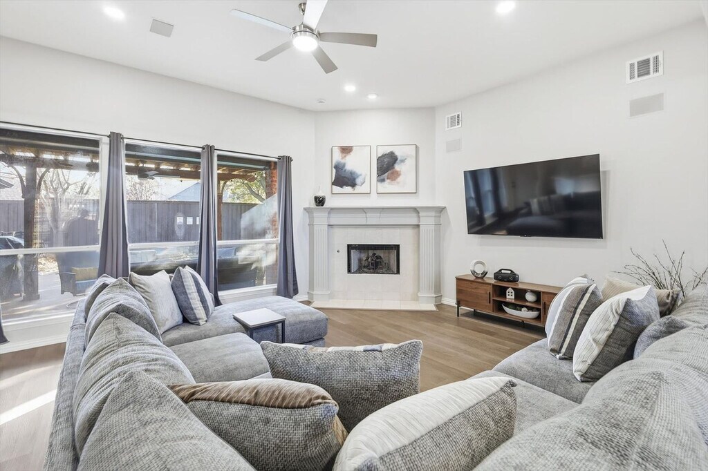 Feel at home in this luxurious vacation home in Lewisville, Texas, featuring 4 bedrooms and 2.5 bathrooms. This spacious home offers a backyard paradise with a pool, patio, and BBQ grill. This home features a fully equipped kitchen with stainless steel appliances including double ovens, a fridge, freezer, stove, microwave, and dishwasher, as well as a kitchen island and breakfast nook. The dining area includes a formal dinner table with seating for 6+ and a breakfast nook with seating for 4+. The living area features a comfortable oversized sectional, a flat-screen TV, and Wi-Fi. Additional amenities include a cinema and game room, and a laundry room equipped with a washer and dryer. Complimentary parking is included with your stay. This home can accommodate up to 10 guests, and there is an additional fee of $29/night for each guest beyond the first six. House-trained pets are welcome with a non-refundable pet fee of $150 per pet, with a maximum of 2 pets per stay. Located in a dynamic suburban community, this home is minutes from DFW International Airport and offers easy access to North Texas. Nearby attractions include Lewisville Lake Park, Wayne Ferguson Plaza, and the Lewisville Grand Theater. Dallas attractions such as the ICR Discovery Center for Science & Earth History and the Mandalay Canal Walk at Las Colinas are also within driving distance. Parties or large unauthorized gatherings are not allowed. Smoking of any type is not allowed, and violations are subject to a $450 fine plus the cost to clean, deodorize, and repair damages. Check-in is at 4pm and check-out is at 10am. Only registered guests are allowed on the property. The fireplace is operated on gas and should only be used by those familiar with its operation, and should not be left unattended. Plenty of body towels are provided, but guests are welcome to bring their own pool towels. Registration Number: STR-25-216 [SI]