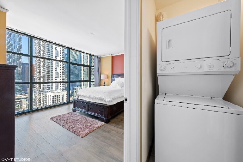 Property Id: 56605 **Fully Furnished Rental with Amazing Views at Chicago Millennium Park ** This very large one-bedroom(833sqft), one bath fully furnished luxury condominium in Chicago's award winning Lakeshore East is ready for your rental, featuring great park views and city views through its floor to ceiling windows, a walk-in closet and W/D in unit. The area's master plan won the 2002 American Institute of Architects National Honor Award; and the park and area have won numerous awards. You can easily walk to Lakeshore East Park, Millennium Park, the Navy Pier, the Art Institute of Chicago, the Magnificent Mile, the AON Center, the Chicago River Walk, including the Adler Planetarium and Shedd Aquarium. Monthly rent covers ALL expenses except electricity. Wireless internet, cable, gas, air conditioning, heat, furnishings, bed sheets, and towels all come included in the rent. Just bring your tooth brush and your clothes! Please call now, we look forward to your stay.
