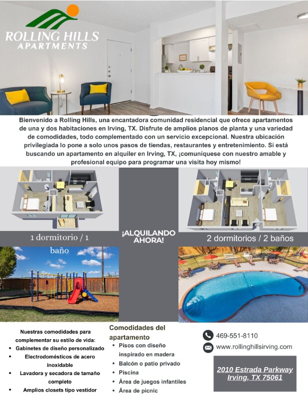 Property Id: 2153717 Welcome to Rolling Hills, a residential community featuring studio, one and two bedroom apartments in Irving, TX. Spacious layouts and amenities welcome you home, along with exceptional service and an ideal location within walking distance to shopping, dining and entertainment options. Are you looking for an apt for rent in Irving, TX? Contact our friendly, professional office staff to schedule a tour today. Convenient Living EXPLORE OPEN LIVING SPACES All 1 Bedroom 2 Bedrooms 2 Bedrooms 1 Bed | 1 Bath 530 Sq. Ft. $1,010 Default image 1 Bed | 1 Bath 530 Sq. Ft. $1,044 - $1,089 Default image 1 Bed | 1 Bath 717 Sq. Ft. $1,050 Default image 1 Bed | 1 Bath 717 Sq. Ft. $1,160 - $1,205 Default image 2 Beds | 2 Baths 890 Sq. Ft. $1,450 Default image 2 Beds | 2 Baths 890 Sq. Ft. $1,465 Default image 2 Beds | 2 Baths 958 Sq. Ft. $1,550 - $2,160 Default image 2 Beds | 2 Baths 958 Sq. Ft. $1,610 Default image