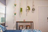 Experience the vibrant heart of downtown Orlando with this modern 1-bedroom studio, perfectly situated just steps away from restaurants, shops, and nightlife. This cozy studio offers a private entrance within a well-maintained triplex, ensuring a comfortable stay for up to two guests. The studio features a comfortable queen bed and a full bathroom, making it ideal for solo travelers, couples, or business guests. The kitchenette is fully equipped with essentials like a 2-burner stovetop, air fryer, and slow cooker, perfect for preparing light meals. Enjoy the shared patio for outdoor relaxation and take advantage of the shared laundry facilities available daily from 9:00 a.m. to 6:00 p.m. Parking is available for one compact vehicle, and pets are welcome with a fee of $60 per small dog. A maximum of two house-trained and non-aggressive dogs are allowed, with crates required if left alone indoors. Leashes are required when outside, and pets are not permitted on furniture. Owners are responsible for cleaning up after their pets both indoors and outdoors. Nestled in downtown Orlando, this studio is a gateway to the city's best attractions. Lake Eola Park is just 10 minutes away, offering a scenic oasis with swan boats and walking trails. Explore the trendy Thornton Park District, known for its stylish boutiques and lively restaurants, just 8 minutes away. The Orlando Science Center and Harry P. Leu Gardens are also nearby, providing engaging experiences for all ages. Noise levels should be kept low between 8:00 p.m. and 8:00 a.m. to maintain a peaceful environment. Smoking indoors is strictly prohibited and will result in an automatic complaint. Check-in is at 4:00 PM and check-out is at 10:00 AM, with late check-out potentially incurring additional fees. A security camera is installed outside near the entrance for safety, and guests are asked not to tamper with it. Windows do not open, so please do not attempt to force them. Furniture should not be moved, and if necessary, should be returned to its original position before check-out. The property is treated regularly for pests, but some insects and wildlife are common in Florida. Doors should be kept closed to minimize their presence. Complete a pre-arrival form and sign the rental terms before your stay. Dispose of food waste properly and keep the kitchen clean and tidy. Report any damages before checkout as charges may apply. Quiet hours are from 10 PM to 8 AM, and noise should be kept to a minimum. [SI]