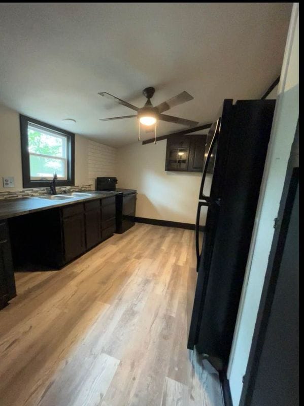 This charming rental unit offers a stylish and comfortable living space with updated features throughout. The kitchen boasts modern dark, beautiful countertops, The open-plan design flows easily into the dining and living areas, with easy access to natural light through large windows. The bathroom is contemporary, featuring a modern vessel sink, vanity, and plenty of storage, along with clean, minimalistic finishes. A large window allows natural light to fill the room, creating a relaxing atmosphere. The spacious bedroom includes original hardwood floors that lend character to the room, complemented by a ceiling fan for added comfort. The room is versatile, offering space for your personal touch and furniture. **Futon's and Fridge are no longer in the home. Coffee table and dining table are still there**