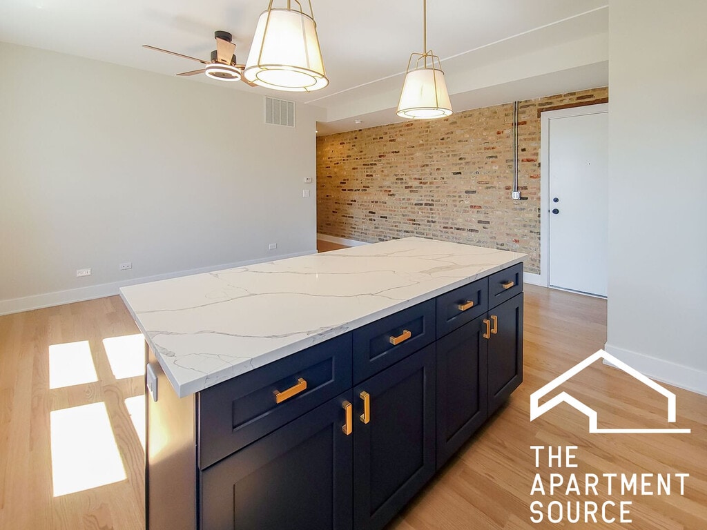 UNIT FEATURES: * Spacious, remodeled 1-bed * In-unit laundry * Central Air / Gas Heat * Modern kitchen * Large island * Gorgeous blue cabinetry * Gold hardware * Stone countertops * SS appliances * Dishwasher * Microwave * Hardwood flooring Disclaimer: The Apartment Source Call or text: