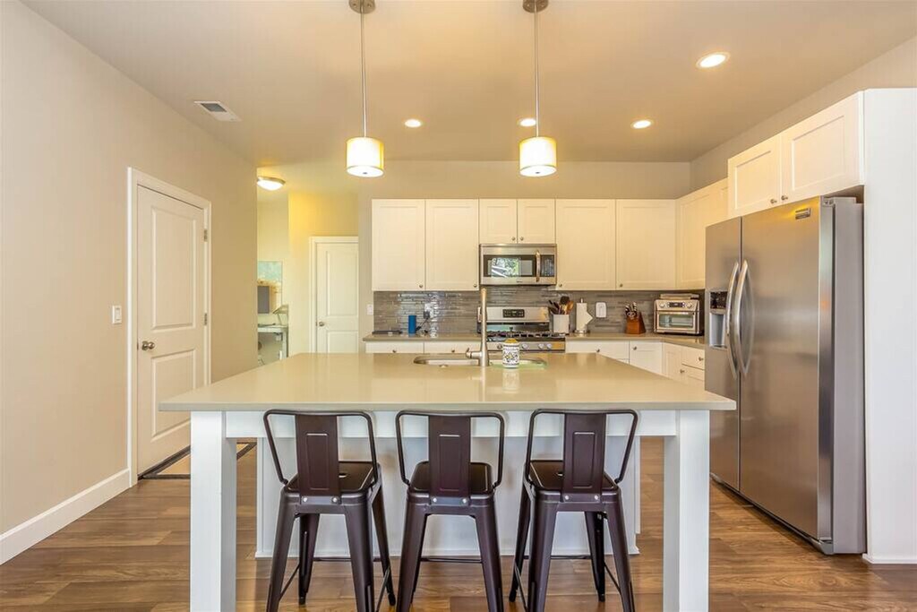 Feel at home in this beautiful home that offers so much for the working traveler, family, or group of friends. This home features three bedrooms and two full bathrooms. Sonata Getaway is the perfect home away from home, offering space, comfort, and a prime location for your Central Oregon adventures. This home features hardwood floors throughout the main living areas and plush carpet in all bedrooms for added comfort. The fully equipped kitchen features quartz countertops, a full-size refrigerator, a gas stove, a toaster oven, and a wireless speaker. The dining room features a large dining table that seats six. The cozy living room has a large TV connected to Apple TV, an oversized sofa, multiple armchairs, and a gas fireplace. The master suite features a king-size bed, a massive walk-in closet, a dresser, and a private en-suite bathroom with dual sinks and a standing shower. The two guest rooms each have queen beds and closet space, sharing a hallway bathroom with a tub/shower combo. This home includes an air purifier. The fully enclosed backyard is perfect for kids or furry friends to play safely. The patio has an outdoor seating area with a gas grill for BBQ dinners or casual picnics. A charge of $40.00 per pet, per stay will be added to your reservation, excluding service dogs. Conveniently located near Foxborough Park, Larkspur Park, and close to the Deschutes River Trail, this home is ideal for scenic walks and outdoor fun. It's a short stroll away from Larkspur Park and Foxborough Park. The home is a quick drive to breweries, restaurants, and shopping in downtown Bend. Mt. Bachelor is approximately 30–35 minutes away. The High Desert Museum and Old Mill District are family-friendly attractions just minutes away. Starbucks is a 2-minute drive or a 7-minute walk away, Fred Myers is a 3-minute drive or 11-minute walk away, Alpenglow Park is a 6-minute drive, Bend Factory Outlets is a 1-minute drive, Old Mill District is a 4-minute drive, Bend Rock Gym is a 4-minute drive, Larkspur Community Center and Park is a 5-minute drive, Northwest Crossing is 11 minutes away, Smith Rock State Park is 35 minutes away, and Redmond Airport is a 22-minute drive away. If a noise complaint is called in by a neighbor after 10 pm, the Deschutes County Sheriff will be notified, and you could be evicted from the property without a refund. Guest is responsible for any and all injuries and/or damages to person or property caused by any pet. Guest must clean and properly dispose of all pet excretions immediately upon discovery. If the property is pet-friendly, any dog must be one year or older and registered prior to arrival. Includes a sit/stand desk with wireless charging and a dedicated office space with a desk and desktop computer. [SI]