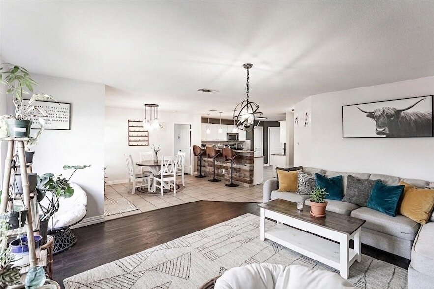 This beautifully updated, open-concept 3-bedroom home features a flexible office space that can easily serve as a 4th bedroom, no carpet and a large back covered patio. Situated on an oversized lot, this home offers comfort, style, and space both inside and out. Step inside to a large, inviting entryway with a dedicated office or flex room just off the front hall. Continue into the heart of the home where the spacious living room, dining area, and kitchen flow seamlessly together perfect for entertaining or everyday living. Enjoy luxury vinyl plank flooring, abundant natural light, and plenty of room for your favorite sectional. The kitchen is a chef s dream with granite countertops, a stylish ceramic tile backsplash, stainless steel appliances, a built-in microwave, cooktop, walk-in pantry, and a charming coffee bar. Bar seating and pendant lighting add extra flair to the breakfast area and dining space. Retreat to the spacious owner s suite featuring triple windows, LVP flooring, and a spa-like ensuite bath with dual sinks, an upgraded tiled shower, garden tub, and a generous walk-in closet. Step outside to your private backyard oasis! A massive 21' x 17' covered patio is perfect for relaxing or entertaining, and the fully fenced yard includes mature trees and a sprinkler system. Heartland s extensive amenities include over 400 acres of parks and picnic areas, a 35-acre stocked lake with fishing pier, miles of hike and bike trails, and two separate amenities compounds in the community. Enjoy the new Oasis amenity center features two 30 ft. waterslides, 3 pools, a 5000sf event center, and 6000sf fully-loaded fitness center, plus a splash pad, playground, outdoor game room, and snack bar just in time for summer! New HEB about 6 miles away! Pet Friendly, move-in ready!