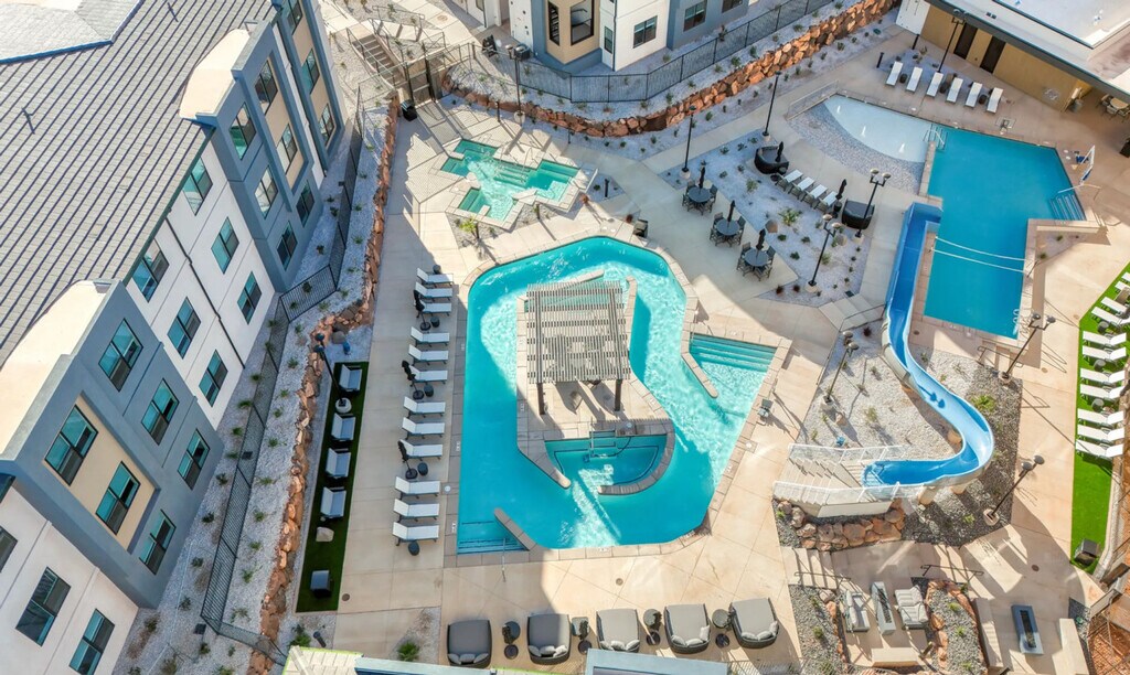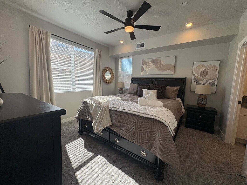 The advertised rate of $4,516/month is the lowest available price, based on a 30 day(s) stay with a move-in date of July 21, 2027. Rates vary depending on the duration of stay, season, and other parameters. For exact pricing and additional pricing components, please visit our website and enter your desired move-in and move-out dates. The rate is applicable when billed upfront; it can be higher if billed in multiple payments. Feel at home in this comfortable Southern Utah retreat, located just 20 minutes from Zion National Park. This single-level condo offers easy first-floor access with no stairs and is ideal for hikers, adventurers, and families exploring Zion, Sand Hollow, and the surrounding red rock landscapes. This condo features a fully equipped kitchen and an inviting living space. The fully stocked kitchen includes everything needed for cooking at home. An in-home washer and dryer add extra convenience, making traveling and hiking easy and stress-free. The bathroom is thoughtfully designed with mobility-friendly features, including grab bars near the toilet and shower, a roll-in shower with no lip, shower chair, and a handheld shower head for added comfort and ease of use. Guests can enjoy resort-style community amenities in this brand new complex, including a heated community pool, lazy river, sports pool with volleyball net, a corkscrew waterslide, hot tub, and fire feature tables for evening relaxing. Poolside loungers and patio seating with tables and chairs, walking paths and shared outdoor spaces are also available. Pickleball courts are coming in the fall of 2026. Located in the heart of Hurricane, this condo is perfectly situated for exploring Southern Utah’s outdoor adventures, golf courses, and stunning red rock landscapes. The area is a popular basecamp for hiking, boating, off-roading, and golf trips while staying close to Zion National Park. Nearby destinations include Zion National Park (26 miles), Quail Creek State Park (7 miles), Sand Hollow State Park (9 miles), and Snow Canyon State Park (19 miles). Nearby golf courses include Green Spring Golf Course (7 miles), Coral Canyon Golf Course (7 miles), Sky Mountain Golf Course (8 miles), Southgate Golf Club (12 miles), and Sunbrook Golf Club (15 miles). This is a 100% smoke-free property, and any violation will result in a $200 per day fine for the duration of the stay. Undisclosed or unauthorized pets will incur a $250 fee. Guests must clean up after their pet, and a $25 fee per instance of uncollected waste outdoors will be applied. Guests are responsible for professional cleaning costs for indoor "accidents" and the full cost of any property damage caused by pets. Unauthorized late check-outs will be charged $50 per hour. Moving furniture is not allowed, and a $500 fee will be assessed if the cleaners have to move furniture to reset the property for the next guest. [SI]