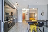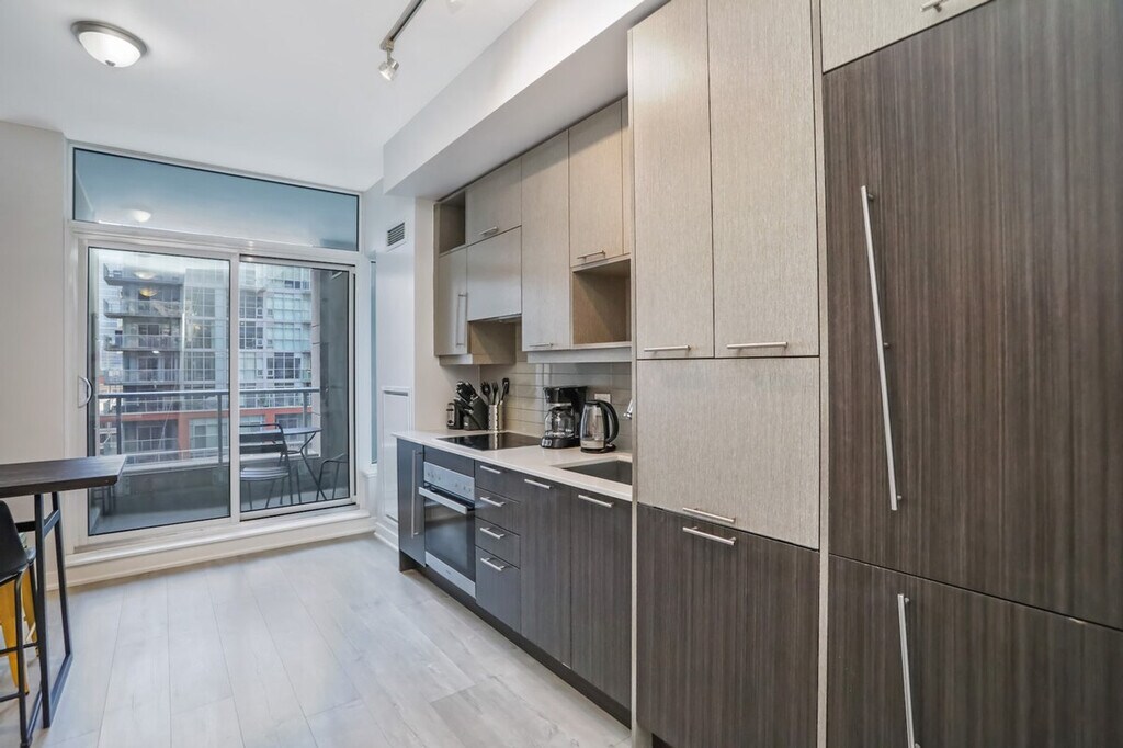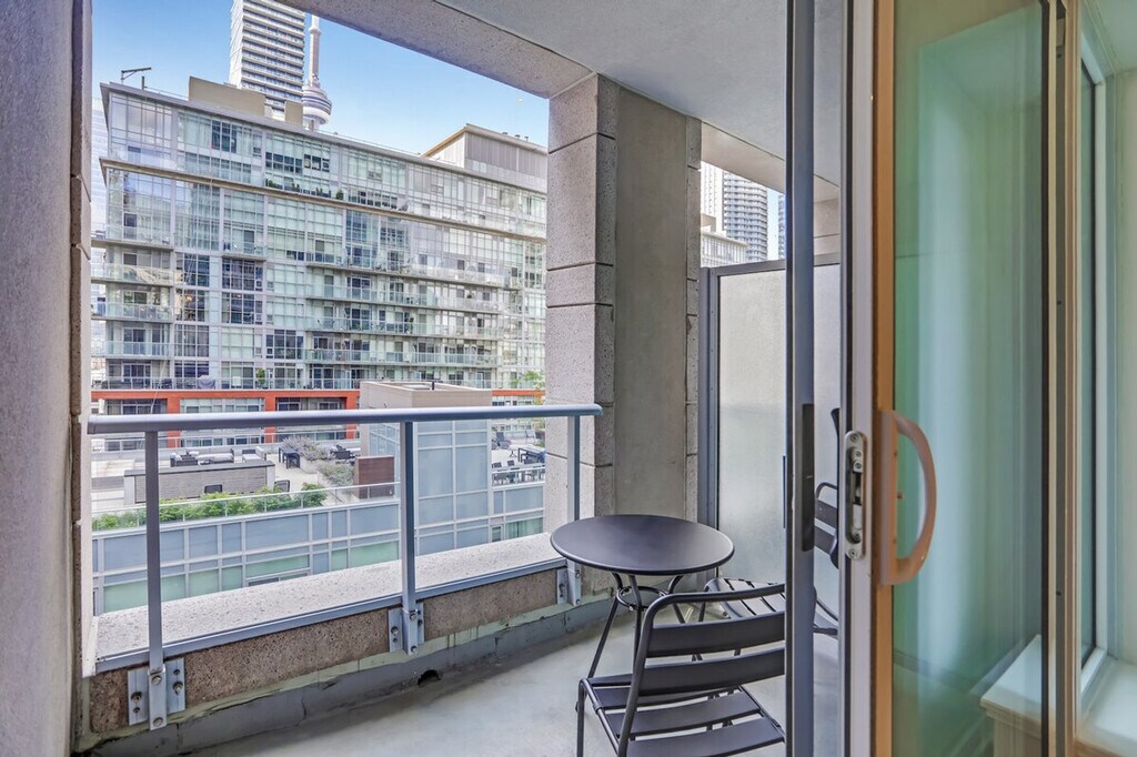 Feel at home in this clean and modern 1-bedroom apartment on Richmond St W, complete with a balcony. This apartment features a fully equipped kitchen and in-unit laundry. Entertainment is provided by a smart TV, and you'll have access to 2 Gbps unlimited fiber internet. Enjoy access to a state-of-the-art fitness facility and a rooftop terrace. Amenities are at your doorstep, including groceries and dry cleaning. The apartment is less than 5 minutes from Osgoode Subway, hospitals, and the Financial District. This apartment has a 30-night minimum stay. Includes a workspace with a desk and chair in the living area. [SI]