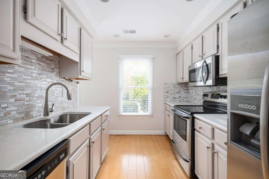 This exceptionally roomy townhome offers an open and inviting floorplan in an incredibly convenient location. The kitchen has been recently renovated and now showcases brand new quartz countertops, a chic backsplash, and stainless steel appliances. It seamlessly flows into a generous living area, complete with a cozy fireplace and a sunroom that fills the space with natural light. The interior has been freshly painted in tasteful, designer-neutral colors. A private backyard adds to the charm, and the split bedroom layout, each with its own full bath, makes it an ideal roommate arrangement. This home is just minutes away from I-285, Smyrna Market Village, Vinings Jubilee, the Silver Comet Trail, and a wealth of other amenities.