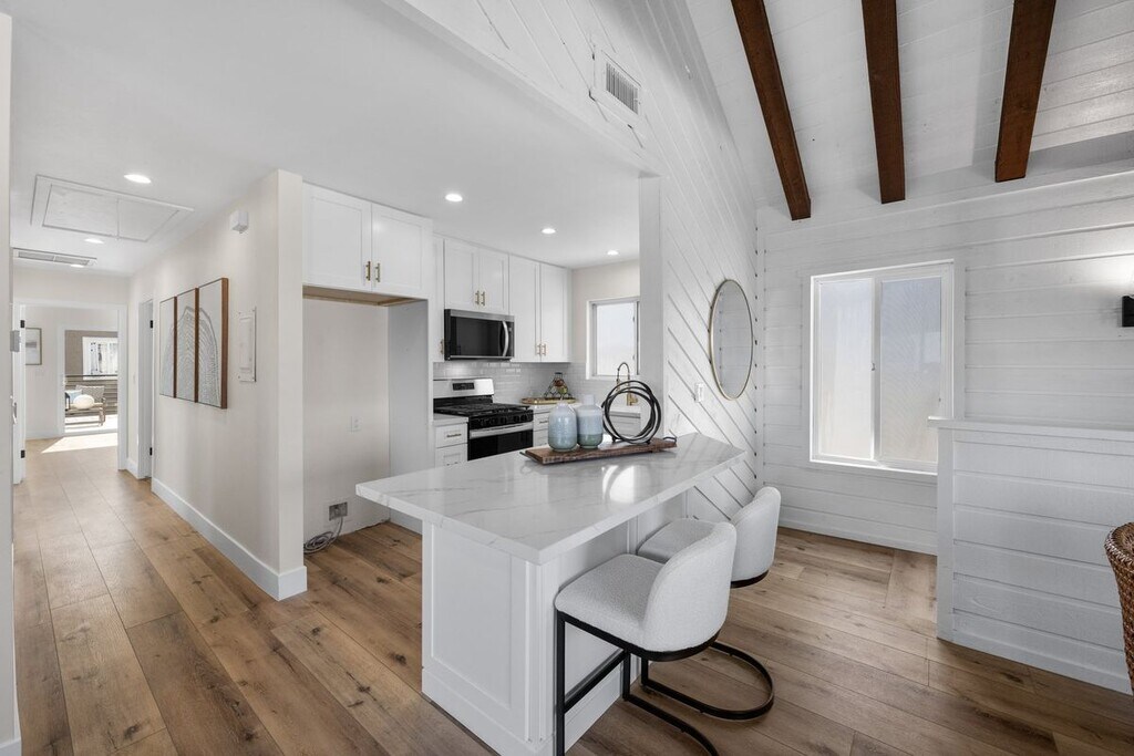 ***Remodel in Newport Shores *** Upgraded upstairs unit await the pickiest renters. Upgraded recessed lights, brand new kitchen with stylish single basin sinks, bathrooms with glass showers and custom tile work. Everything is complemented perfectly with favorite colored hardware and fixtures. 3 bedroom/ 2 bath is a top unit has a brand new oversized composite deck out back that's a perfect gathering spot for friends and family to enjoy the stand-alone Newport Beach weather. Open the windows and sliding doors to a partial ocean view and breathtaking sunsets or just take in the breeze that you will never get sick of. If that’s not good enough you can head out across the street to feel the sand yourself. Enjoy the Southern California lifestyle, with easy access to hidden gem restaurants, coffee spots and beaches to surf, paddle-board and biking. Did I mention 2 parking spots?? Staged furniture not include in rent