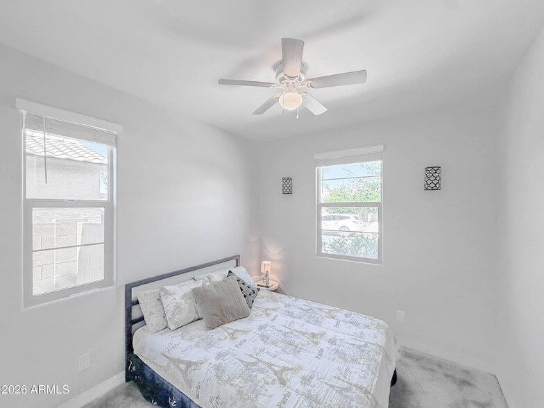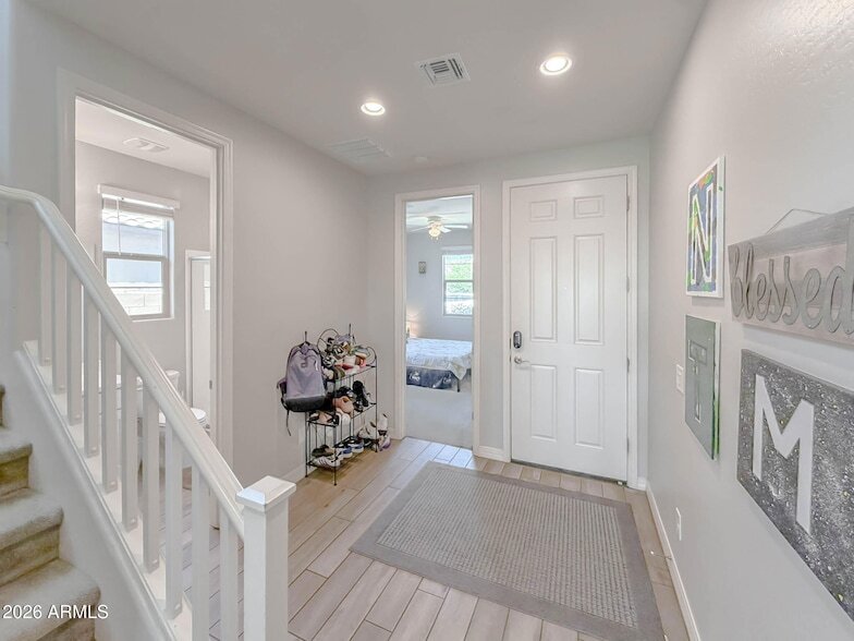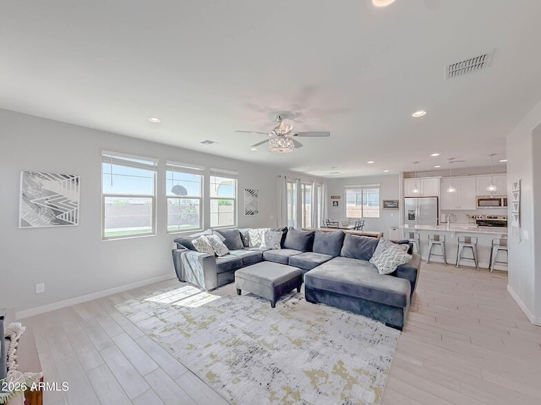 Save on electric with solar panels included. EV ready garage with 240V NEMA 14-50 outlet, Universal outlet for Level 2 electric vehicle charger. Beautiful 5-bedroom, 3-bath in an almost new house in Queen Creek offering modern, open-concept living. The spacious kitchen features a large island and opens to the living room, creating a great flow for everyday living and entertaining. Five bedrooms plus an upstairs loft provide flexible living and gathering space. The landscaped backyard includes low-maintenance artificial turf, and the community pool adds recreational options nearby. Well-maintained and move-in ready, an attractive choice for renters seeking contemporary design and convenient amenities.