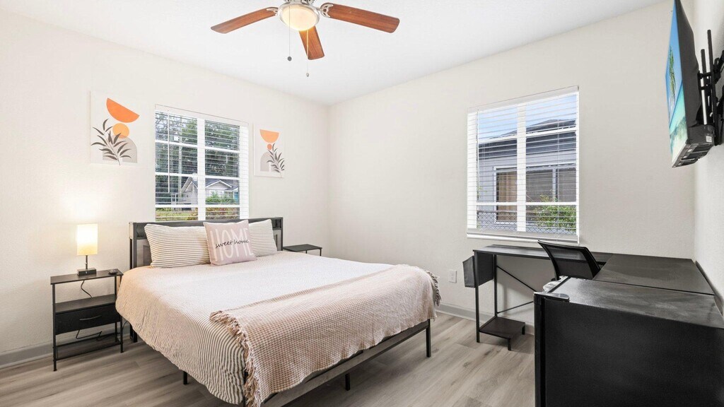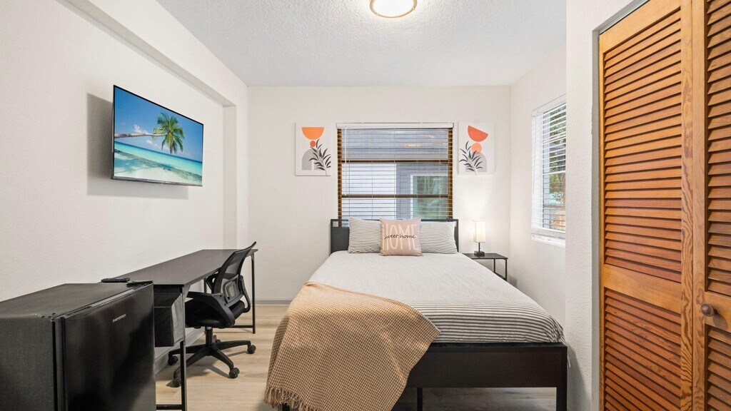 Room for rent: Welcome to The Coco Home: —a beautifully renovated property designed for comfort, convenience, and connection. With two thoughtfully crafted buildings, this home has something for everyone. The front house features 5 bedrooms and 2 bathrooms, all fully renovated and ready for you. Each bedroom is outfitted with a mini-fridge, work station, smart TV, full-size mirror, plenty of closet space, and high-speed Wi-Fi, ensuring a space that feels like home from day one. The shared kitchen is modern and functional, making meal prep a breeze. The backhouse offers a sleek vibe with just 2 private bedrooms, epoxy flooring throughout, and a brand-new kitchen. It’s the perfect private retreat for those who value style and simplicity. Conveniently located near public transport and all the amenities Jacksonville has to offer, The Coco Home is ideal for anyone looking for modern, simple living. With monthly cleaned common areas & beautifully updated spaces, this property is the obvious choice!