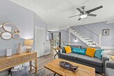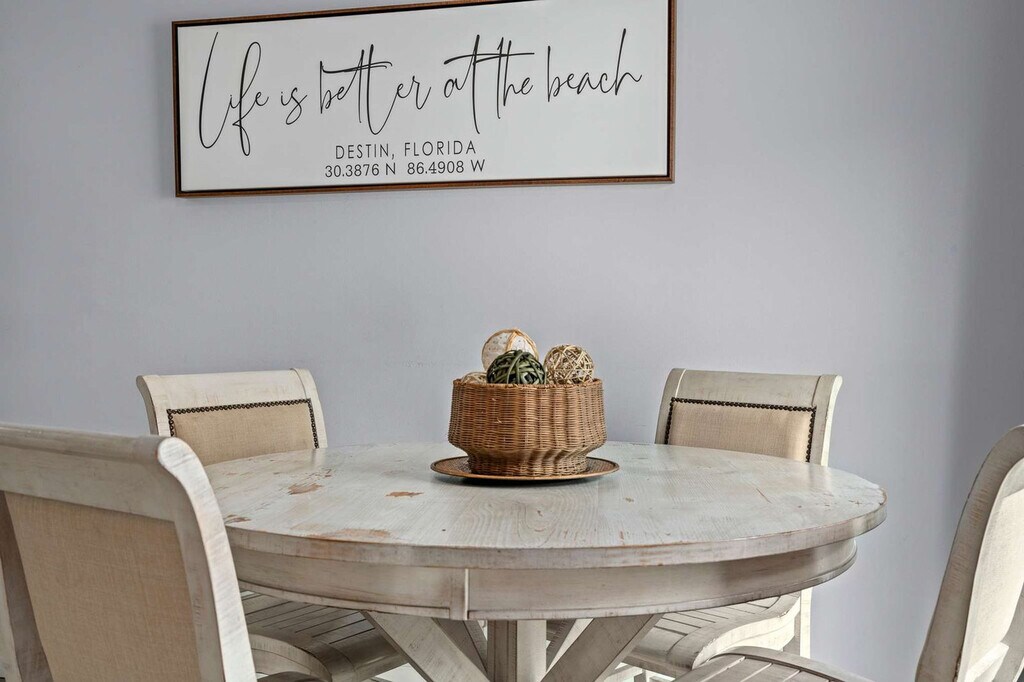 Experience the cool coastal vibe of Destin with this modern and spacious apartment located in the heart of Holiday Isle. Just minutes away from the private gated beach access, you'll feel at home in this beautifully designed space featuring four private balconies to enjoy the stunning views. The apartment offers a King bedroom and a Queen bedroom, both with en-suite bathrooms, as well as two Queen sleeper sofas for additional guests. The kitchen is fully equipped with stainless appliances, dishes, silverware, pots and pans, bakeware, a toaster, blender, and crockpot. A coffee and wine bar with a Hamilton Beach Flexbrew Coffee Maker, wine and beer cooler, and ice maker adds a touch of luxury. The living area is bright and airy, with a Smart TV and board games for entertainment. Parking is available for one vehicle in a numbered spot, with additional parking across the street. Please note that watercraft, trailers, box trucks, RVs, and campers are not permitted in the complex. Nestled in the heart of Destin on Holiday Isle, this apartment offers easy access to the private gated beach just a five-minute walk away. Enjoy the vibrant local scene with nearby attractions and the convenience of fishing docks right outside your front door. Check-in is at 4pm and check-out is at 10am. Early check-in or late check-out is not available without prior notice. A strict noise ordinance is in place at 10pm, and no house parties or excess noise are permitted. Guests under 25 are not allowed, and any violation of this policy will result in forfeiture of payment and cancellation of stay. No smoking indoors or on balconies is allowed, and a $115 fee applies for any lost or damaged beach keycard. Additional cleaning fees may apply for excess trash or debris, and any issues must be reported during the stay. Pets are not allowed at this location. The dining area provides a small table and chairs, perfect for meals or working from home, ensuring a comfortable remote work-friendly environment.