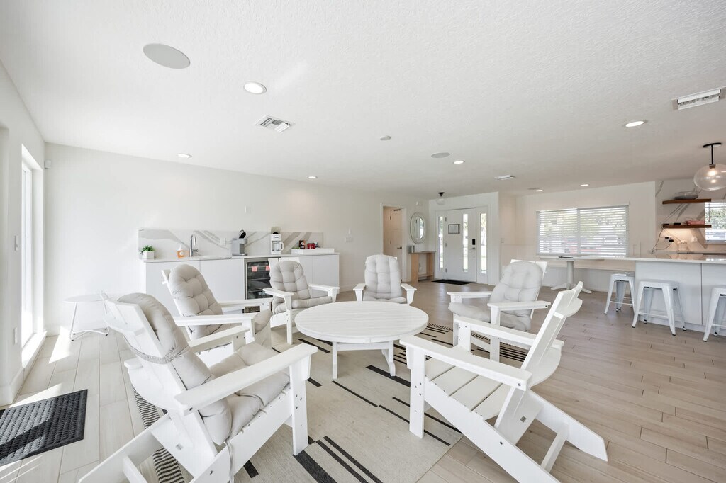 Welcome to this beautifully remodeled 4-bedroom, 3-bathroom open floor plan home, where you can feel at home while enjoying complimentary kayaks and paddleboards. Spot native Florida birds, dolphins, and manatees, or witness jaw-dropping rocket launches from the charming patio. Discover the nearby downtown Cocoa Beach by taking a leisurely bike ride through the idyllic neighborhood. Kick back, relax, and enjoy a game on the giant flat-screen TV. Craft culinary masterpieces in the fully equipped, luxurious kitchen featuring a spacious island suitable for the entire family. Retreat to this peaceful oasis after a thrilling day, where the tranquility of the waterfront awaits. This luxurious home offers a truly unique and unforgettable stay. Step inside and be greeted by an open and spacious layout, perfect for accommodating large families or groups of friends. The fully equipped kitchen is a chef's paradise, complete with high-end appliances and a generous island. Gather around the giant flat-screen TV for movie nights or sporting events. The 4 bedrooms are tastefully decorated, providing a sense of comfort and relaxation. The master suite boasts a king-size bed, an ensuite bathroom with a giant soaking tub and gorgeous shower. The remaining bedrooms offer cozy queen-size beds and ample storage space. Two more huge, beautiful bathrooms offer plenty of space to refresh in. Outside, the patio beckons you to unwind in the comfortable Adirondack chairs, while the sparkling pool invites you to take a refreshing dip. The dock, just steps away, is the ideal spot to catch a stellar rocket launch or savor a captivating sunset. To ensure a comfortable start to your stay, an initial stock of essentials is provided, including paper towels, toilet paper, tissues, coffee pods, creamer, sugar, light cleaning supplies, garbage bags, sponges, dish soap, and dishwasher tabs. If additional supplies are needed during your stay, please plan to replenish them as needed. Situated in a beautiful Cocoa Beach neighborhood, this home is perfectly located for those seeking both relaxation and adventure. You'll be delighted by the proximity to the iconic I Dream of Jeannie Lane, a must-visit for fans of the classic TV show. Nature enthusiasts will be thrilled to explore the nearby Banana River on the provided kayaks and paddleboards. A short bike ride will transport you into downtown Cocoa Beach, where you can immerse yourself in the vibrant local scene. Indulge in delicious dining options, boutique shopping, and lively entertainment. With the beach just across the street, you'll have endless opportunities for sun-soaked relaxation and fun-filled water activities. Due to severe pet allergies, pets are not allowed. Mailbox access is not available for guests. All reservations require either a refundable security deposit or the purchase of a damage waiver. [SI]