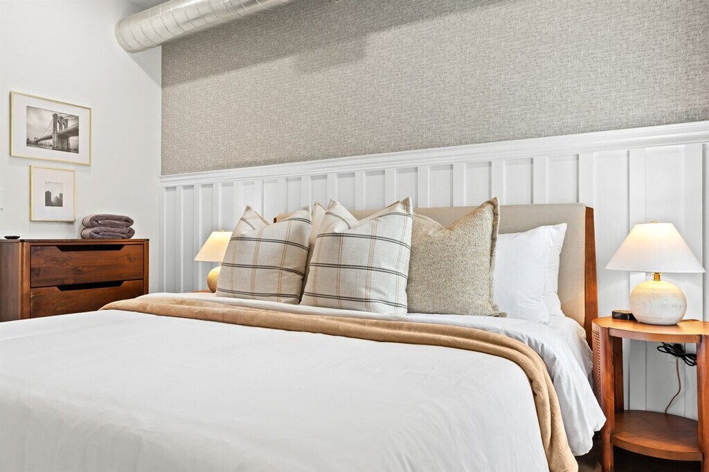 Welcome to this beautiful Ferndale loft, where comfort, style, and location come together. This thoughtfully furnished 2-bedroom upper-level loft offers a peaceful retreat just steps from downtown. Enjoy the spacious living room with a Smart TV, a fully equipped kitchen, and the convenience of in-unit laundry. The loft features a king bedroom and a queen bedroom, both with Smart TVs, and offers free Wi-Fi and high-speed internet. With central air conditioning and heating, you'll feel at home in any season. This upper-level 2-bedroom, 1-bath loft is designed for comfort, simplicity, and functionality. With stylish décor and modern conveniences, it's perfect for travelers looking for a peaceful, well-equipped stay in Ferndale. The bright and cozy living room features a Smart TV, and the fully equipped kitchen includes dishes, cookware, a coffee maker, and wine glasses. The full bathroom comes with fresh towels, shampoo, and body soap, and extra pillows and blankets are provided for added comfort. Located in a quiet neighborhood just blocks from downtown Ferndale, the home offers quick access to local restaurants, boutiques, and major freeways, making it ideal for both short-term and extended stays. Enjoy the walkable location with easy access to Ferndale’s top restaurants, bars, coffee shops, and boutiques. Guests will have full, private access to the entire upper-level unit during their stay, including a designated entryway. This private upstairs unit ensures a peaceful and quiet environment. Smoking and parties are not allowed, and violations may result in penalties. The loft includes a private workspace set-up with fast Wi-Fi, making it remote work-friendly. A laptop computer is not included, but the high-speed internet ensures seamless connectivity for all your work-from-home needs.