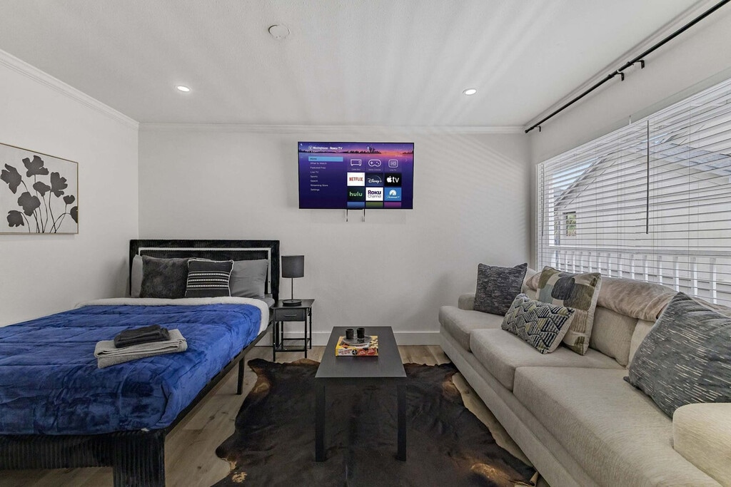 Feel at home in this stylish and simple upper-floor apartment located in the heart of Montrose, Houston. This 2-bedroom, 1-bathroom apartment features three full beds, comfortably accommodating up to six guests. Enjoy the convenience of an assigned parking spot and easy access with smart lock entry. The apartment offers a fully equipped kitchen with appliances and starter supplies, perfect for preparing meals during your stay. Relax in the living room with a smart TV and enjoy high-speed 1Gbps Wi-Fi, ideal for work or streaming. Coin-operated laundry facilities are available on-site for your convenience. Pets are welcome with host approval, and cleaning fees apply. Unauthorized pets will incur a $500 extra fee. Mid-stay cleanings are required weekly for extended stays of 7+ nights, with a fee. Flexible arrival and departure options are available, though fees may apply. Situated in the vibrant Montrose neighborhood, this apartment is within walking distance to a variety of restaurants, parks, nightlife, and shopping. Enjoy short drives to the Medical Center, Downtown, NRG Stadium, and more. The area is known for its eclectic charm, tree-lined streets, and a strong sense of community, making it perfect for experiencing authentic Houston living. Quiet hours are from 10 PM to 8 AM to ensure a peaceful environment for all guests. Parties are not allowed, and associated fees may apply. Smoking is permitted outside the property only. Check-out is at 10 AM, with a $25 fee for every late unapproved hour. For your safety, a valid government-issued ID and a signed rental agreement are required prior to check-in. Security cameras are placed in exterior areas for guest safety. The apartment is equipped with high-speed 1Gbps Wi-Fi, making it great for remote work or streaming needs. [SI]