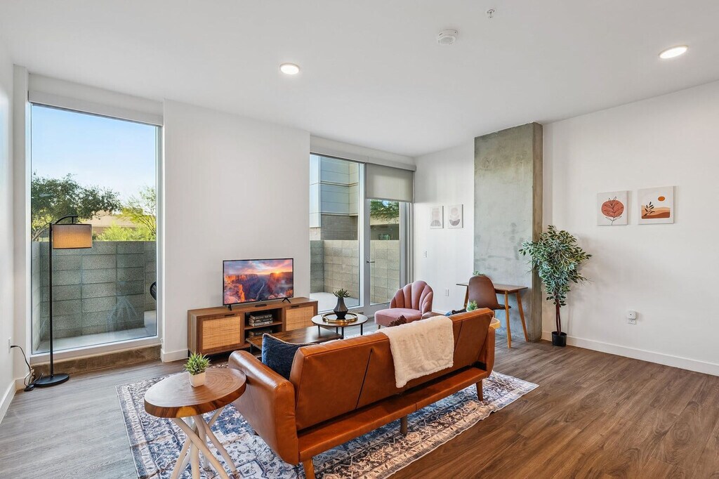 Feel at home in this modern, bright studio in Phoenix’s entertainment district. This apartment is suitable for a family, group of friends, or business travelers and has all of the amenities necessary to enjoy your stay. Great amenities include a fitness center, co-working and conference room, game room, courtyard, dog park and parlor, indoor and outdoor lounge, swimming pool, hot tub, and bike storage. Valet parking is available for $25 per day or $350 per month. Mid-stay cleanings and early check-in/late checkout are available for an additional fee. A pet fee between $100 and $300 will be collected separately, based on stay length, with a maximum of 2 pets (40lbs combined). All pets must be on a leash when outside on the property. Adeline is centrally located in the heart of entertainment, within walking distance to Fry’s Food and Drug, the Mortgage Matchup Center, Chase Field, the Phoenix Symphony, and Heritage Square. With sophisticated dining, shopping, and entertainment experiences just blocks away, Adeline offers a convenient, big-city lifestyle in the center of diverse culture and modern comfort. This apartment is right next to the Valley Metro light rail system, making it easy to explore the rest of the Valley. Adeline offers excellent walkability with shops, dining, and entertainment just steps away. Fry’s Food & Drug, Chase Field, and the Phoenix Symphony are all within a short walk. The property is next to the Valley Metro Light Rail, providing easy access throughout Phoenix and the surrounding Valley. Taxis, rideshares, and scooter rentals are also readily available in the area. This is a smoke-free environment, and any sign of smoking is a violation of the stay agreement, which may result in immediate termination and recovery fees beginning at $500. There is a $500 penalty for removing smoke detectors and a $200 penalty for lost key fobs. No outside guests are allowed without permission. Quiet hours are observed from 9 pm to 8 am each day. Guests must agree not to disturb neighbors at all times during the stay. The home is proactively monitored with decibel sensors for compliance with this noise policy. No weapons or drugs are allowed; police will be called for violating this rule. Check-in is at 4 PM, and check-out is at 11 AM, with a $75 per hour late fee. One towel is provided per guest per stay. A valid photo ID is required to complete the booking. The minimum age requirement of the primary person booking should be 22 years old for out-of-town guests and 25 years old for local guests. Guests will be asked to provide a copy of their official government-issued photo ID, confirm their contact information, and pass through a verification portal. In some instances, a criminal background check may be required. Failure to provide these documents will result in a cancellation and denied entry. A pet fee may be charged for guests traveling with an emotional support animal. Additionally, the presence of emotional support animals can be declined from stays or Experiences. Registration Number: STR-2024-002926 [SI]