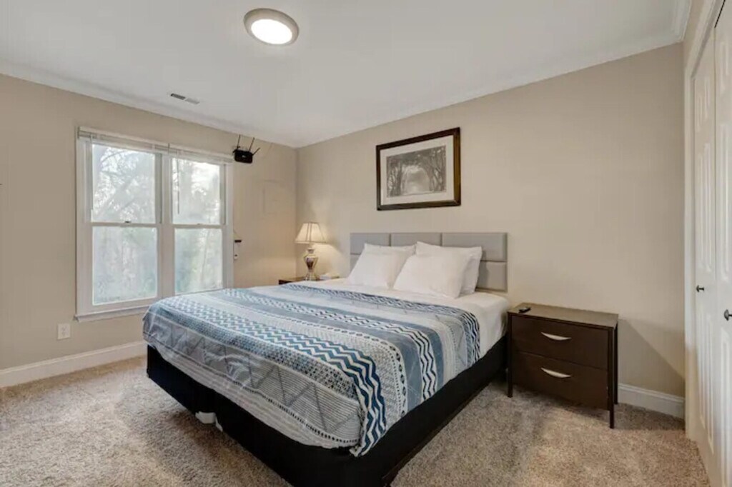 The advertised rate of $2,950/month is the lowest available price, based on a 30 day(s) stay with a move-in date of March 4, 2026. Rates vary depending on the duration of stay, season, and other parameters. For exact pricing and additional pricing components, please visit our website and enter your desired move-in and move-out dates. The rate is applicable when billed upfront; it can be higher if billed in multiple payments. Feel at home in this cozy 2-bedroom, 1-bathroom home on the second floor, perfectly located just minutes from the best of Durham and Chapel Hill. The master bedroom features a luxurious king-size bed, while the second bedroom offers a comfortable queen-size bed. The welcoming living area includes plush seating and a Smart TV. The modern kitchen is fully equipped with sleek appliances, and there is a dining area. The well-appointed shared bathroom offers a clean and modern space. Enjoy the private deck, perfect for relaxing outdoors or enjoying your morning coffee. For your convenience, a washer and dryer are available. A convenient parking space is available for guests. Nestled between major landmarks such as Duke University (8 min), UNC Hospital/University (23 min), and Downtown Durham (5 min), this home is also near Duke Hospital (9 min), Research Triangle Park (13 min), and Downtown Chapel Hill (7 min). Self-check-in is available with a smart lock for added flexibility during your stay. AT&T Fiber Internet is provided for fast and reliable connectivity. [SI]