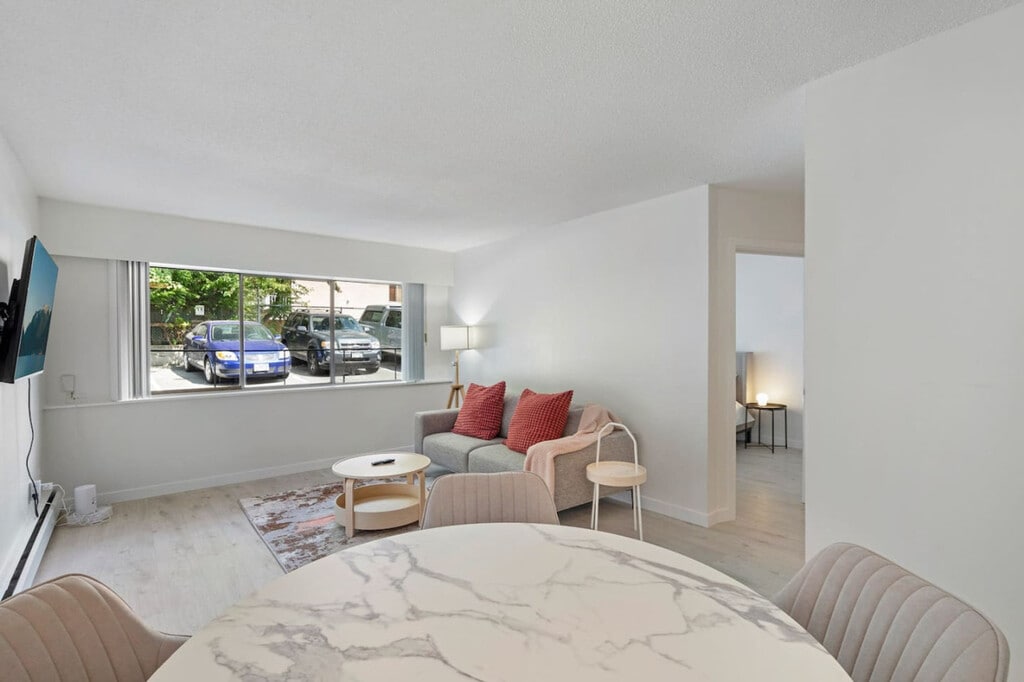 Enjoy a cozy stay and feel at home in this bright and newly updated 1-bedroom condo in Vancouver’s Kitsilano neighborhood. This suite features an open-concept layout with bright, modern furnishings, a fully equipped kitchen with a dishwasher and cooking essentials, a comfortable queen bedroom with fresh linens, a spacious living area with a Smart TV and dining space, a full bathroom with a tub and shower, and free high-speed Wi-Fi. Laundry facilities are available in the shared laundry room for $3 per load. Parking is available upon request and subject to availability prior to your check-in date. Just steps from West 4th Avenue’s shops and cafes, and a short walk to Kitsilano Beach, this apartment offers a true local Vancouver experience. The West Side of Vancouver is known for its tree-lined streets, beautiful homes, and well-manicured gardens. The area is a mix of residential streets and bustling commercial areas. Some of the most popular commercial streets in the area include West Broadway, West 4th Avenue, and West 10th Avenue, all of which feature a variety of boutique shops, restaurants, and cafes. These streets are also home to popular outdoor markets, like the Kitsilano Farmers Market, where visitors can sample locally grown produce and artisanal foods. Explore Vancouver's West Side easily with its well-connected transit system. TransLink operates several bus routes, including the 99 B-Line, connecting the area to Downtown Vancouver. The SkyTrain is accessible via the Canada Line and Millennium Line, while the SeaBus provides scenic views of the harbor. The neighborhood is bike-friendly with rental options available, and walking is a great way to explore. The apartment is a 3-minute walk to W 4th Ave and Kitsilano Beach, an 8-minute walk to the nearest grocery/pharmacy, a 1-minute walk to the nearest transit stops, and a 5-minute drive or 20-minute walk over the bridge to Downtown Vancouver. Heating is only available during cooler months (October–May). No smoking is allowed inside or on the property, and no parties or gatherings are permitted. Any rule violations will result in a minimum $1000 fine. [SI]
