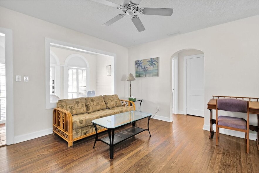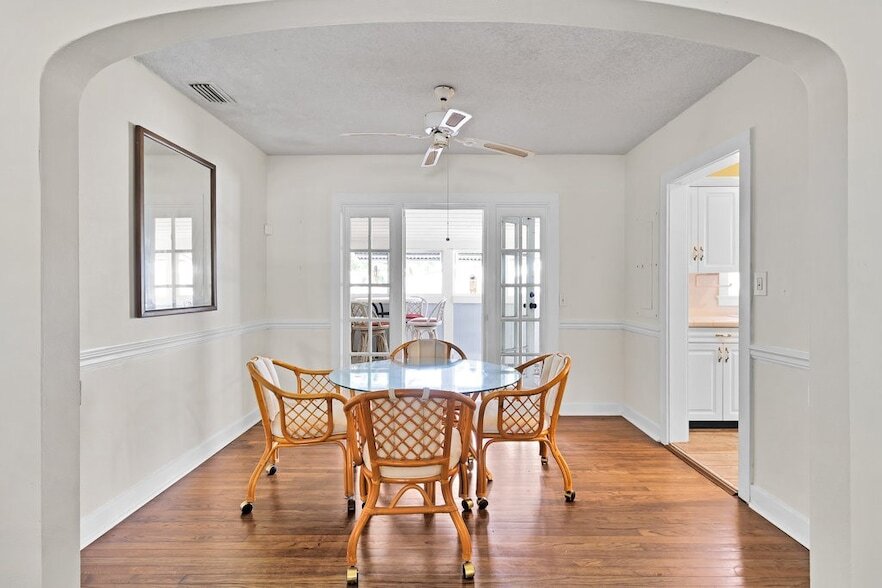 Quaint 3 Bedroom/3 Bath home with fenced in backyard. Walking distance to Library & downtown Vero shopping, dining and activites. Tile and hardwood throughout home. Partially renovated Kitchen with white cabinets, SS appliances, butcher block counter near stove for cooking. Blinds on windows, glass french doors leading to porch/patio to enjoy Florida sunsets & charming porch in the front to sip your coffee & watch the Sunrise! Walk in tiled shower in Primary, freshly painted inside entire home and plenty of parking in front with additional parking in back for additional vehicles!