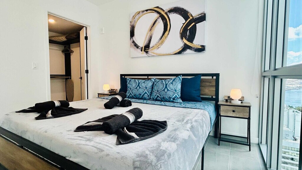 Experience Miami at its finest with this spectacular 27th-floor corner unit, offering a private terrace with stunning city views. Feel at home in this beautifully furnished apartment, ideally located within walking distance to Bayside Marketplace and Kaseya Arena. Enjoy the convenience of the Metromover across the street for easy access to Brickell, and a quick drive to Wynwood, Design District, and South Beach. This apartment offers a serene retreat with a private terrace, one of the building's rare outdoor spaces with open city views. The sunlit living room is perfect for work or relaxation, while the modern kitchen is equipped with appliances for any meal. The bedroom features a king-size bed with memory foam for ultimate comfort, and the sofa bed provides adaptable sleeping arrangements. The bathroom boasts a rainfall shower and sleek finishes, and in-unit laundry allows for longer stays with lighter packing. While parking is not included, convenient options are nearby with public lots just a short stroll away. Centrally located in Miami Downtown, this apartment offers proximity to beaches, shopping, nightlife, and all the city has to offer. Explore nearby attractions such as The Arena, Bayfront Park, and Miami Beach. Public transportation options, including the Government Center Metrorail and Metromover stations, are within walking distance, providing easy access to various parts of Miami. With a Walk Score of 99/100, enjoy a leisurely stroll to nearby restaurants, shops, and cultural sites. Quiet hours are between 22:00 and 8:00. Electronic access is provided by the building's software and requires a smartphone. The primary guest must be at least 21 years old. Essentials like trash bags, toilet paper, hand soap, shampoo, and body wash are provided, but food and cooking condiments are not supplied. Families are welcome, but the apartment does not offer special amenities or safety equipment for children. Perfect for remote work and long stays, this apartment is equipped with all essentials needed for a comfortable stay.