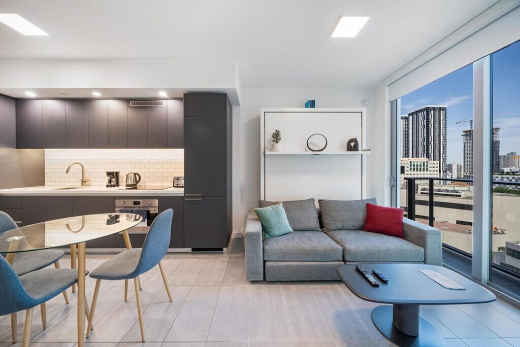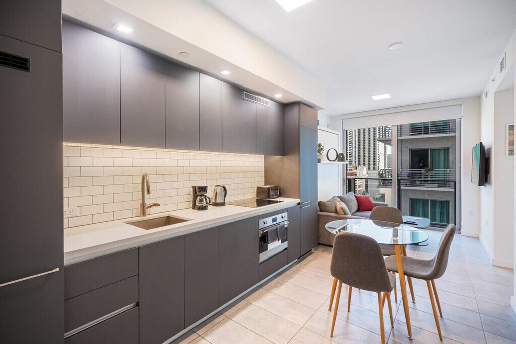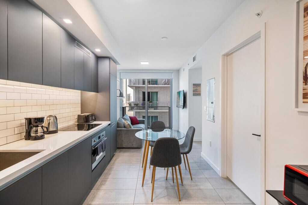 Find your rhythm in this gentle 16th-floor studio above Downtown’s energy. Walk to Kaseya Arena and Bayside Marketplace, with the Metromover across the street for easy access to Brickell. A quick drive takes you to South Beach, Wynwood's street art, or the luxury of the Design District. This studio puts you right where you want to be. A cozy, light-filled studio to recharge or focus, with a kitchen ready for simple meals or your favorite recipe. The bathroom offers a rainfall shower, warmth, and reflection, making it a daily ritual. In-unit laundry adds a practical touch for longer stays or light travelers. Guest-loved amenities include a rooftop pool with skyline views and a Jacuzzi to relax after city adventures. The full gym is always open, allowing you to move at your own rhythm. Onsite dining options include Vela Miami Restaurant and Vela Sky Rooftop Lounge, along with Grab & Go for quick mornings or in-between meetings. Parking is not included, but convenient options are nearby with public lots just a short, peaceful stroll away. Centrally located in Miami Downtown, this apartment offers proximity to beaches, shopping, nightlife, and everything the city has to offer. Explore attractions such as The Arena, Bayfront Park, and Miami International Airport. The iconic Miami Beach/South Beach area is just a short drive away. Public transportation options include the Government Center Metrorail and Metromover stations within walking distance, providing easy access to various parts of Miami. With a Transit Score of 100/100 and a Walk Score of 99/100, it's a paradise for riders and walkers alike. Ridesharing services like Uber and Lyft are also readily available. Quiet hours are between 22:00 and 8:00. Electronic access is provided by the building's software and requires a smartphone. While families are welcome, the apartment does not offer special amenities or safety equipment for children. Essentials like trash bags, toilet paper, hand soap, shampoo, and body wash are provided, but not refilled. No food or cooking condiments are supplied, so plan to pick these up at a nearby supermarket if you plan to cook at home. [SI]