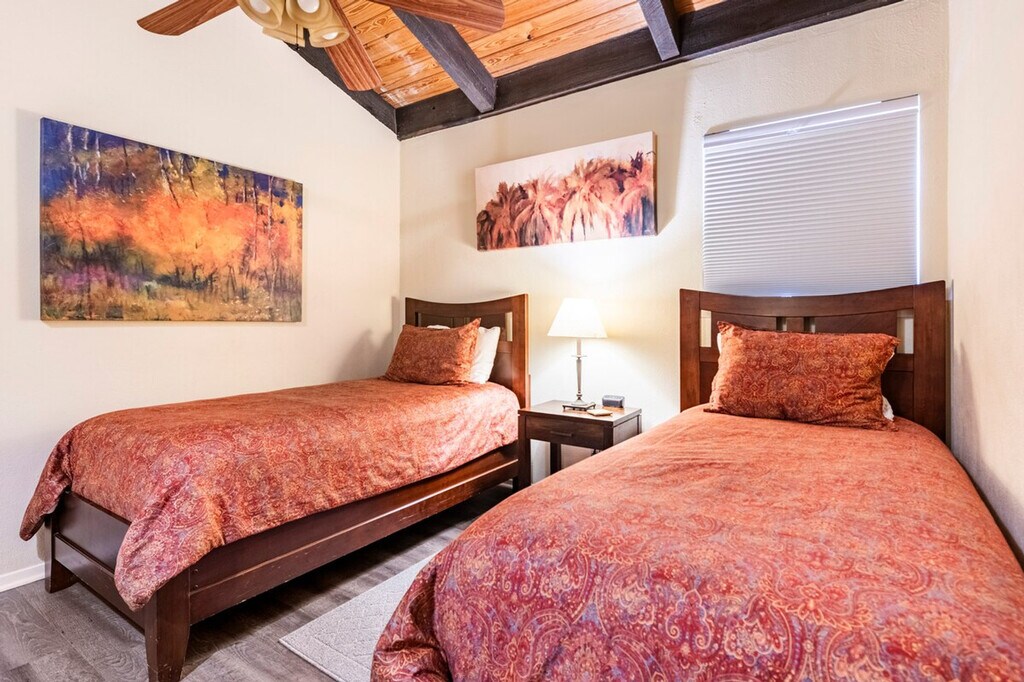 This charming 2-bedroom, 1-bathroom duplex offers a comfortable and accessible living experience with its wheelchair-friendly features, including an entry ramp, roll-in shower, and open space under the sink in both the kitchen and bathroom. Feel at home as you enjoy the serene ambiance of the oak tree shading the partially covered deck, perfect for sipping your morning coffee or unwinding after a day at Barton Springs Pool. The open living, dining, and kitchen area is bathed in natural light from the windows lining the front of the building, creating a welcoming atmosphere. The updated kitchen is fully equipped with everything you need to cook, including fresh organic locally roasted coffee beans, a grinder, filters, and a drip thermos coffee pot, along with tea bags, sugar, cream, and Splenda. A Britta water pitcher, oil, basic condiments, and some spices and herbs are also provided. The dining table seats six with the addition of two folding chairs from the closet. Enjoy the convenience of a gas grill on the deck, complete with tools and grate covers. The duplex is fully stocked with linens and towels, and a washer and dryer are available for guest use. Pets are welcome with a $50 pet fee. For bookings over 28 days, the cleaning fee is $200 and the pet fee is $100. A reserved driveway is available, accommodating one to two cars. Situated just 0.44 miles from Zilker Park, home to Barton Springs Pool, this property is ideally located in the Barton Hills area, making it perfect for exploring Austin. With easy access to downtown, restaurants, shops, and entertainment, you'll have everything you need within reach. Public transportation is accessible with a bus stop about 0.67 miles away on Barton Springs Rd. The hike and bike trails offer a fantastic way to explore Austin by bike or on foot. Bike rentals are available through Barton Springs Bike Rentals, with delivery to the property and a 10% discount available. The property features no-contact check-in with a keyless deadbolt. There are no stairs leading up to the deck and front entryway from the driveway, and the interior is all on one level with grab bars in the roll-in shower and at the toilet. While not ADA compliant, it is wheelchair-friendly for many guests. You are renting the entire property, which is not a shared space. The hosts live nearby and are available if needed. House guidelines are posted in the property. The duplex is equipped with high-speed protected wireless internet, making it remote work-friendly. Smart TVs in the living room and master bedroom provide access to local channels with an antenna. [SI]