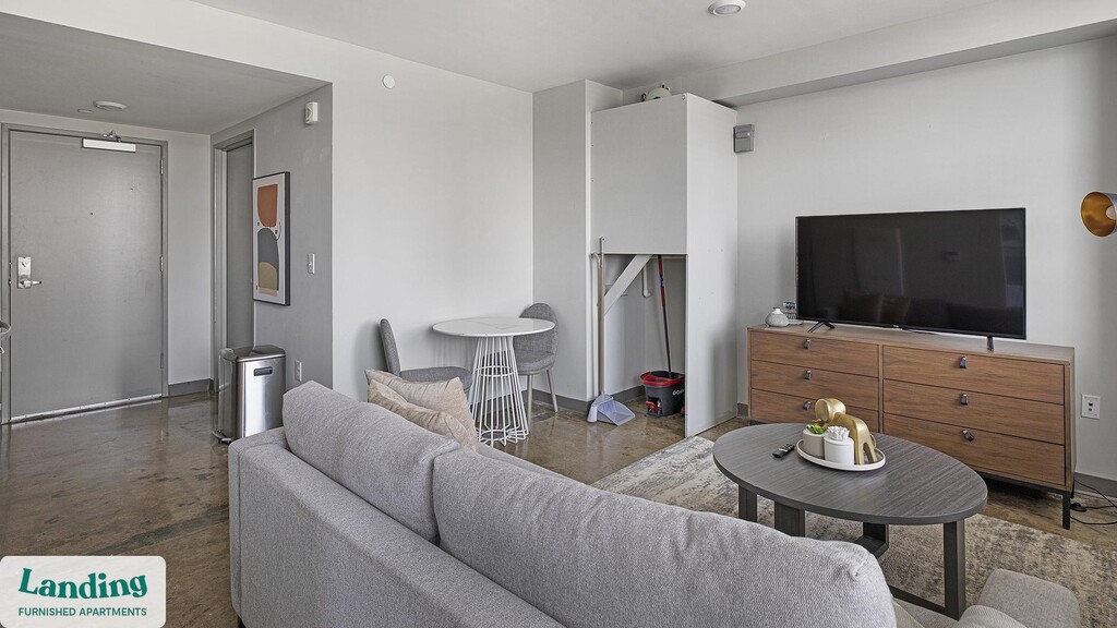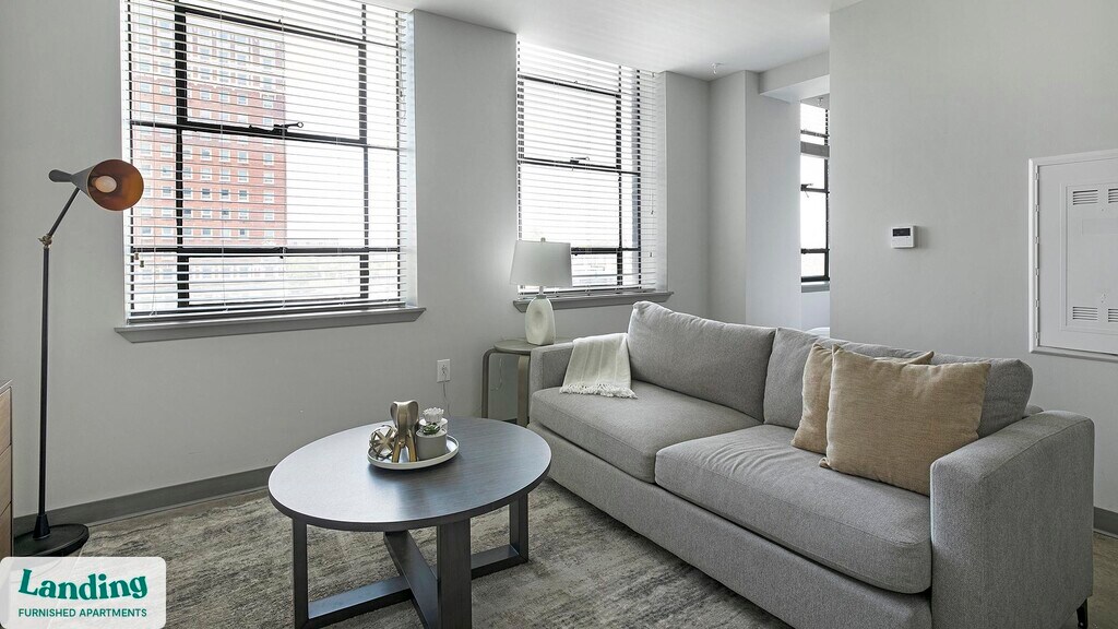 Landing offers flexible lease terms from weeks to months. Please always visit our website or contact us for the latest pricing & availability. Stay longer, save more: 6-Month Minimum base rent: starts at $1299/mo 12-Month Minimum base rent: starts at $1266/mo Landing offers flexible leases across a network of over 35,000 fully-furnished apartments throughout 375+ cities so you can rent on your terms, practically anywhere, and avoid the hassle of paying deposits or application fees. Visit to learn about all the benefits of a Landing membership, see our competitive up-to-date pricing, explore available apartments, take virtual tours, and make reservations online without jumping through traditional rental hoops. Landing's apartments at Lofts at American Life are designed for comfortable, easy living, with the ability to stay as long as you like. Experience living with Landing Every apartment is outfitted with all the modern essentials including: custom-designed furnishings, a fully-equipped kitchen with deluxe stainless steel appliances, a gourmet coffee maker, premium linens, Smart TVs, and incredibly fast, reliable internet for working from home. When you live with Landing, you'll enjoy a hassle-free experience with the added benefit of 24/7 access to our dedicated member experience team. Some of the nitty-gritty: a background check and proof of income are required; we're completely smoke-free; bundled utility packages and pricing vary based on length of stay; pet-friendly options available; listed price reflects a 12-month minimum stay.