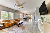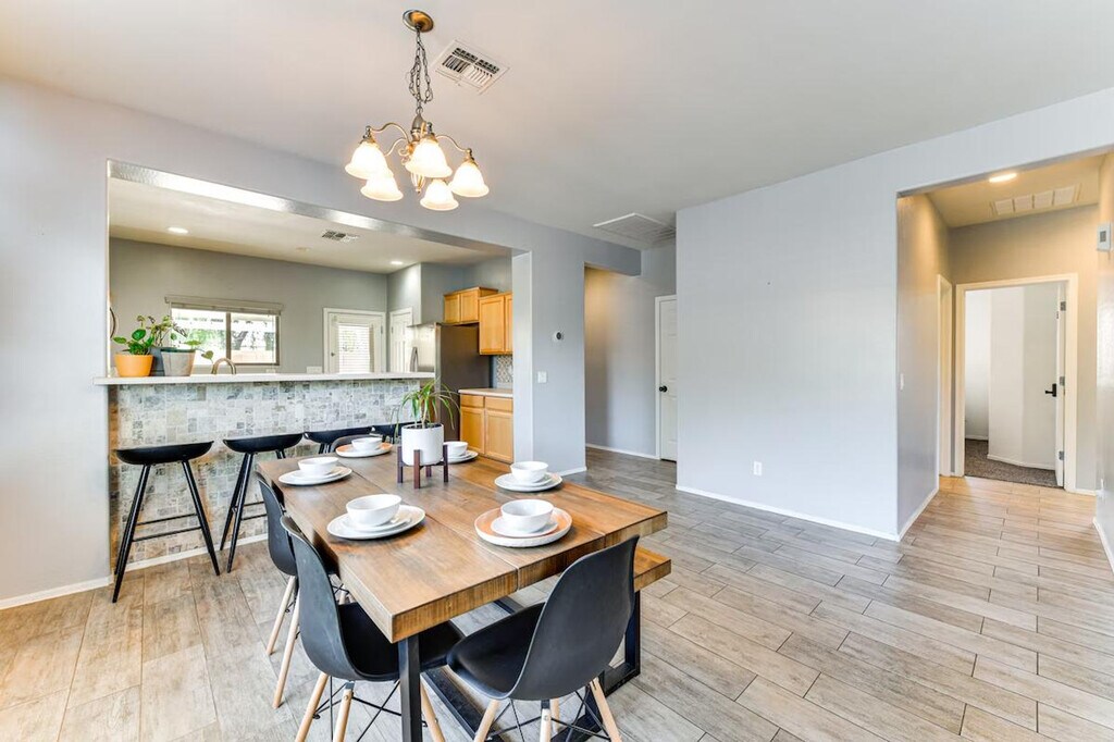 Feel at home in this peaceful Florence vacation rental! This single-story home requires a half step to enter. It features 3-bedrooms and 2-baths. This house is equipped with smart TVs, board games, books, an en-suite bathroom, a walk-in closet, a dining table, and an open floor plan. The kitchen includes a stove/oven, refrigerator, dishwasher, Keurig coffee maker, microwave, cooking basics, blender, ice maker, water filter, trash bags, and paper towels. Enjoy the patio with outdoor seating. This property is dog friendly with a $100 fee. Guests have access to the entire property via keyless entry. Driveway parking is available for 2 vehicles. Enjoy a convenient location near hospitals. Visit Casa Grande Ruins National Monument, which is 11 miles away. Smoking, events, parties, and large gatherings are prohibited. This property features 4 exterior security cameras: 1 camera is located on the front door facing the front outdoor entry, 1 camera is located on the side of the home facing the side of the home and backyard, 1 camera is located on the garage facing the driveway, and 1 camera is located on the garage facing the trash cans. The cameras do not look into any interior spaces. The cameras record video and sound when activated by motion. Includes multiple desk workspaces and free Wi-Fi. [SI]